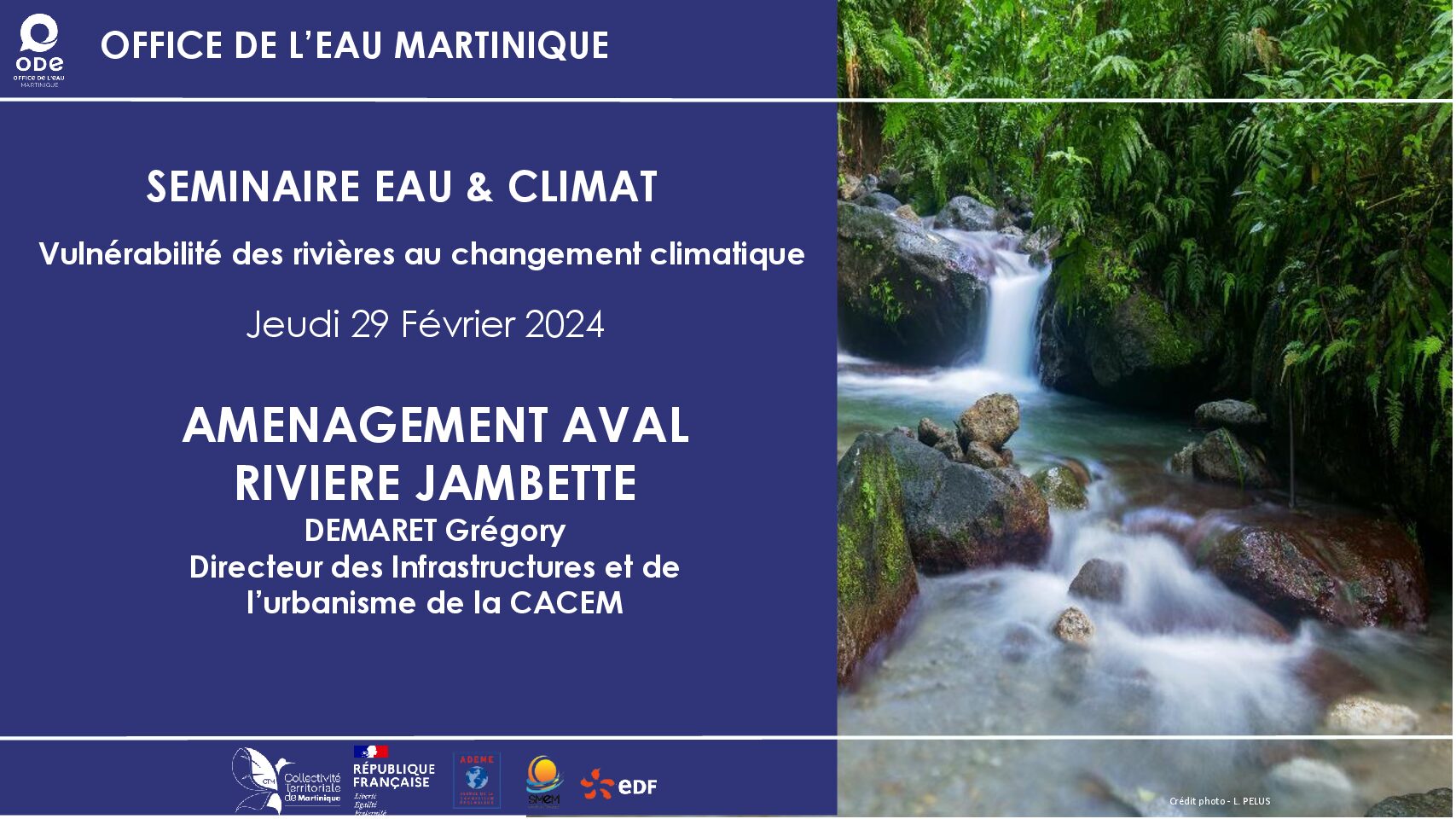 Ce document est une présentation pour le séminaire “Eau & Climat” se concentrant sur la zone aval de la Rivière Jambette, réalisée par Grégory Demaret, Directeur des Infrastructures et de l’urbanisme de la CACEM. Présenté le 29 février 2024, il détaille le cadre, les compétences de la CACEM en rapport avec la gestion de l’eau et l’aménagement du territoire, et spécifie les objectifs et le contenu de l’étude menée sur cette zone. L’étude vise à restaurer l’hydromorphologie et les habitats écologiques, réduire le risque d’inondation, améliorer les paysages urbains et valoriser les milieux naturels.