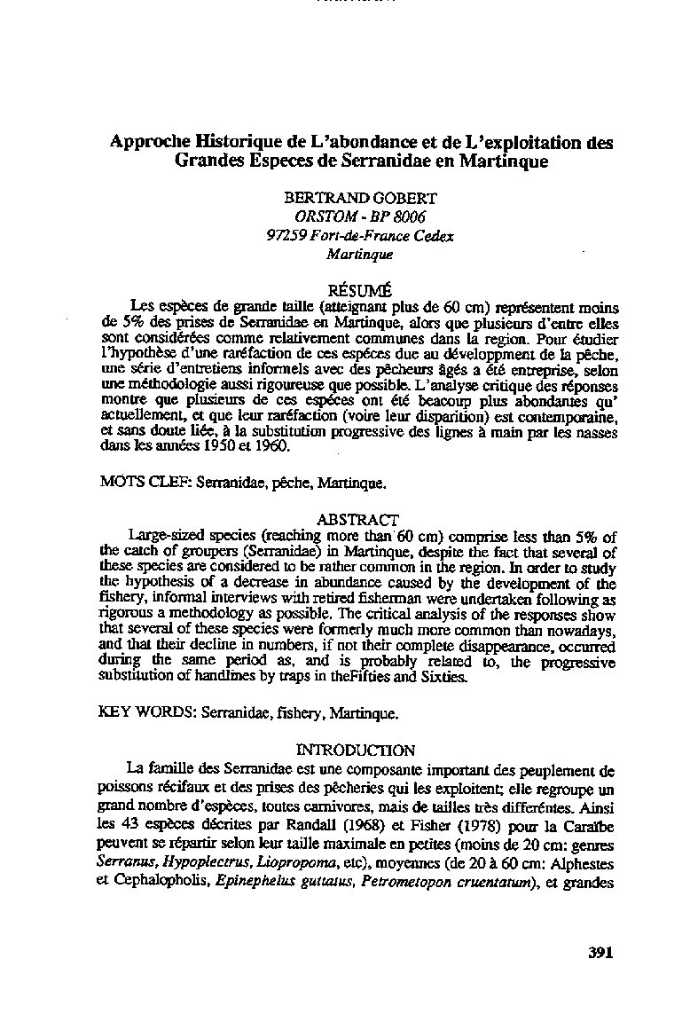 Les epèces de grande taille (atteignant plus de 60 cm) représentent moins de 5% des prises de Serranidae en Martinique, alors que plusieurs d’entre elles sont considérées comme relativement communes dans la région. Pour étudier l’hypothèse d’une raréfaction de ces espèces dû au dévelloppement de la pêche, une série d’entretiens informels avec des pêcheurs âgés a été entreprise, selon une méthodologie aussi rigoureuse que possible. L’analyse critique des réponses montre que plusieurs de ces espèces ont été beaucoup plus abondantes qu’actuellement, et que leur raréfaction (voire leur disparition) est contemporaine, et sans doute liée à la substitution prgressive des lignes à main par les nasses dans les années 1950 et 1960.