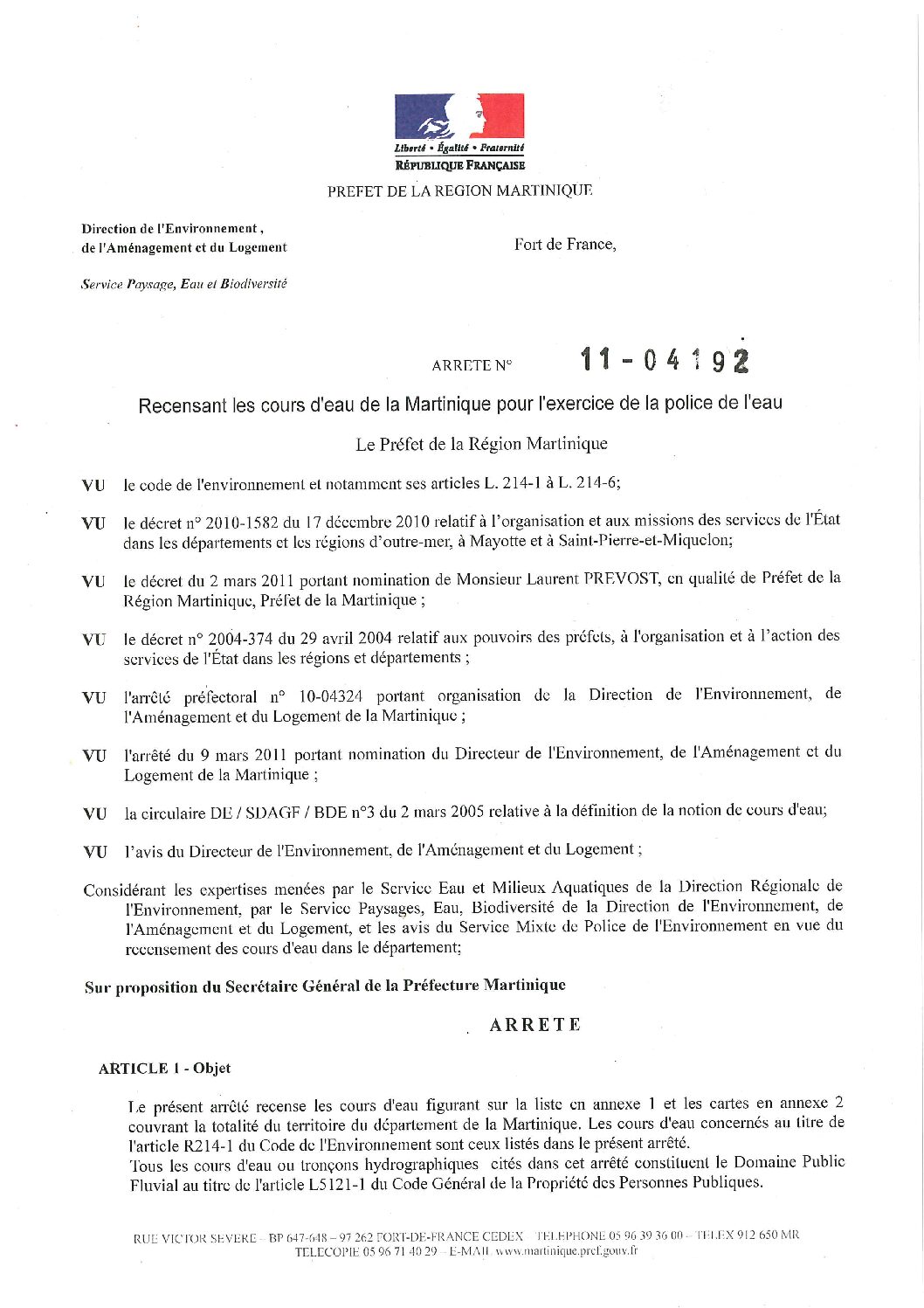 Arrêté n°11-04192 – Recensant les cours d'eau de la Martinique pour l'exercice de la police de l'eau