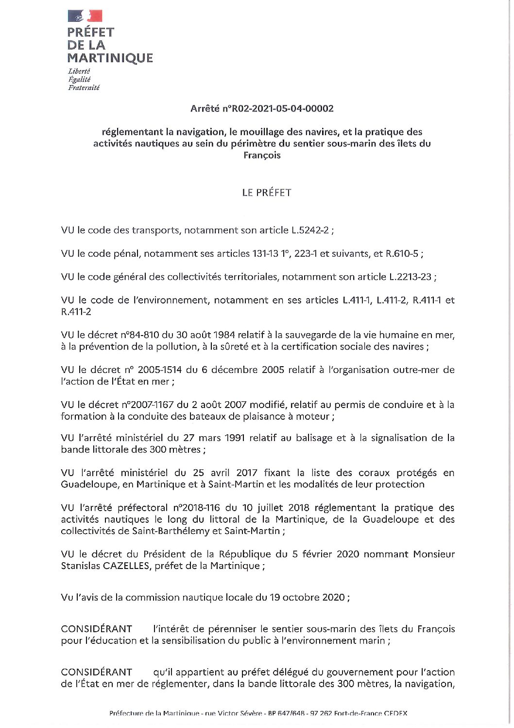 Réglementation de la navigation, du mouillage des navires, et de la pratique des activités nautiques au sein du périmètre du sentier sous-marin des îlets du Françcois.
