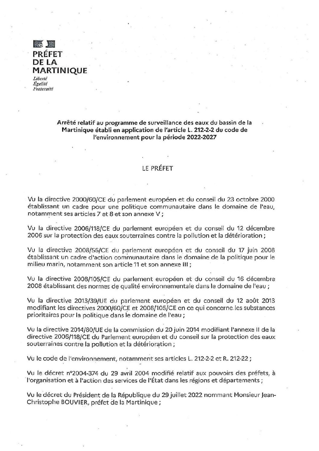 Arrêté relatif au programme de surveillance des eaux du bassin de la Martinique établi en application de l’article L. 212-2-2 du code de l’environnement pour la période 2022-2027