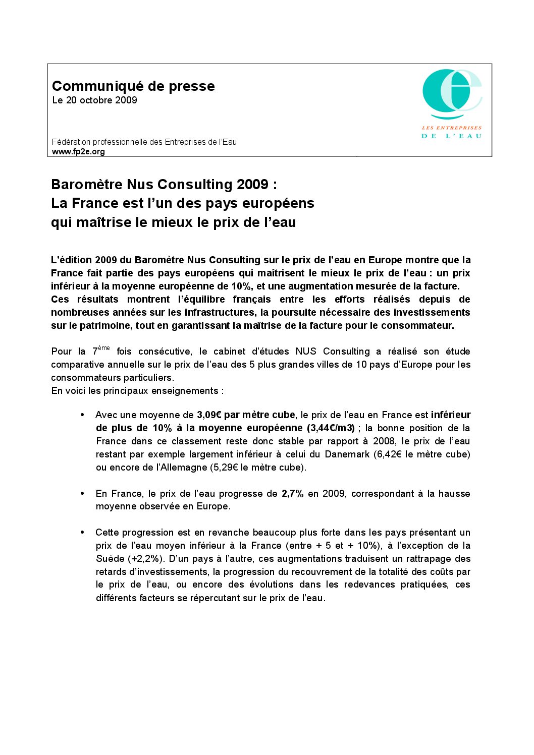 L’édition 2009 du Baromètre Nus Consulting sur le prix de l’eau en Europe montre que la France fait partie des pays européens qui maîtrisent le mieux le prix de l’eau : un prix inférieur à la moyenne européenne de 10%, et une augmentation mesurée de la facture. Ces résultats montrent l’équilibre français entre les efforts réalisés depuis de nombreuses années sur les infrastructures, la poursuite nécessaire des investissements sur le patrimoine, tout en garantissant la maîtrise de la facture pour le consommateur.