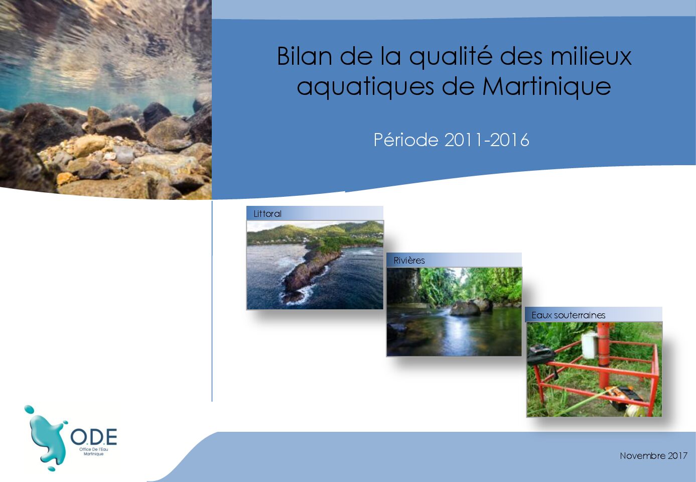 L’Office De l’Eau est chargé du contrôle de la qualité des eaux souterraines, des rivières et des eaux littorales de la Martinique. La présente publication décrit les différents suivis réalisés sur ces milieux et synthétise leurs principaux résultats sur la période 2011-2016.