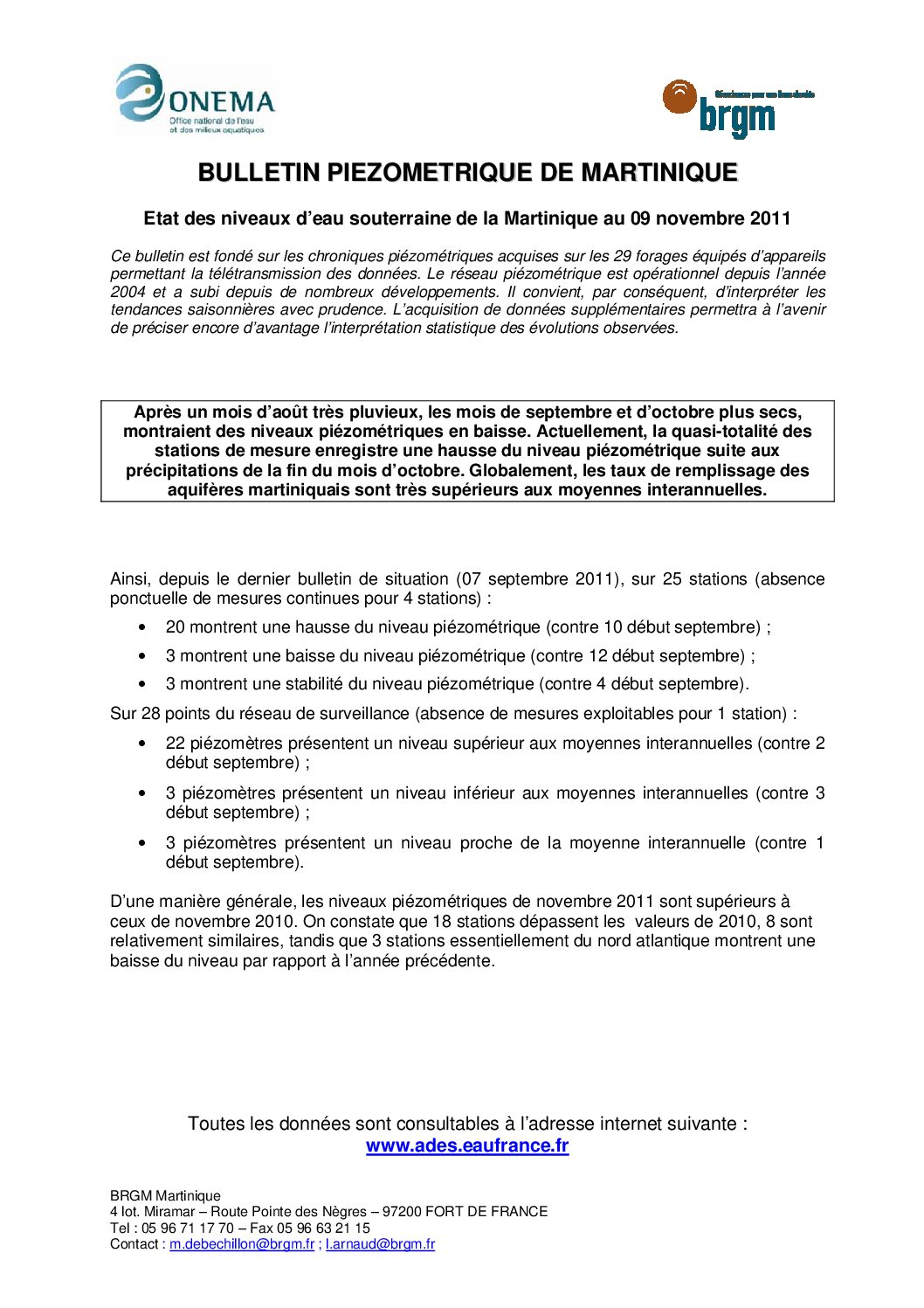 Bulletin piézométrique: Etat des niveaux d’eau souterraine de la Martinique au 09 novembre 2011