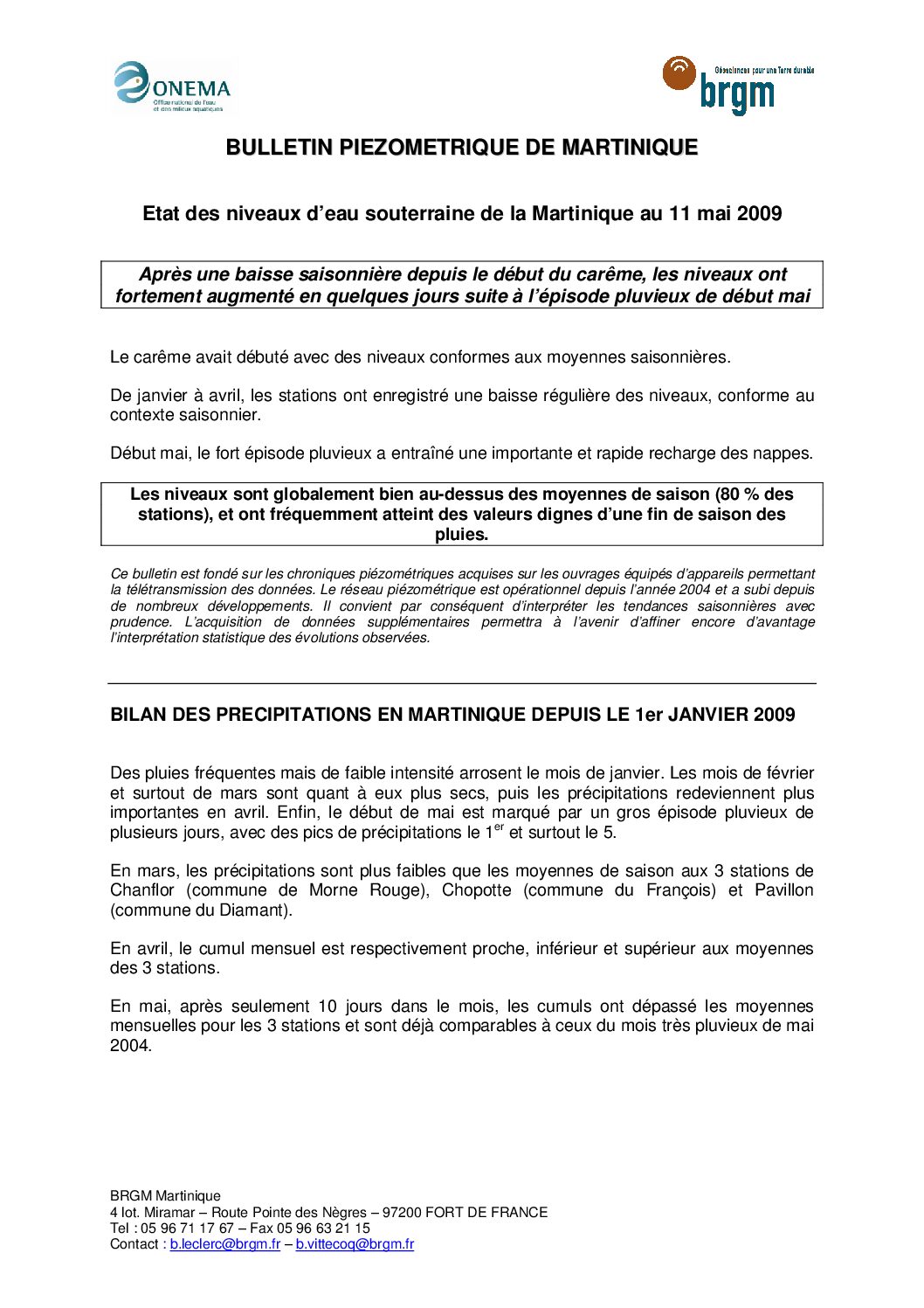 Bulletin piézométrique : Etat des niveaux d’eau souterraine de la Martinique au 11 mai 2009