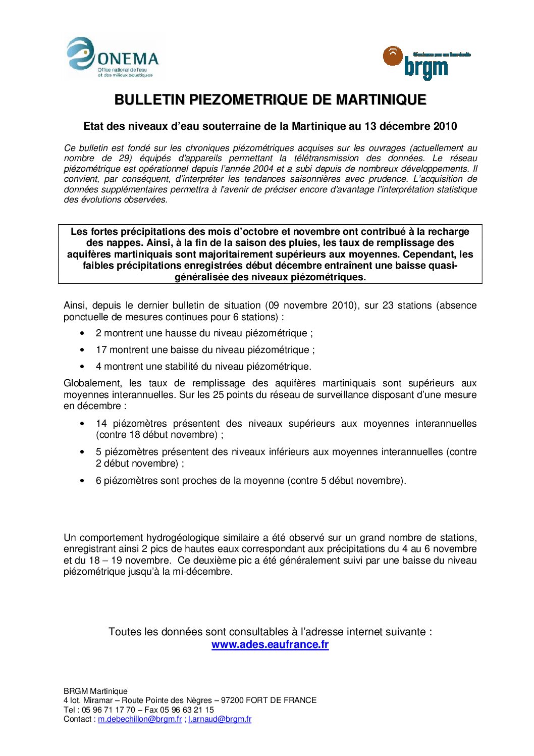 Le bulletin en pièce jointe correspond à la situation des nappes de la Martinique au 13 décembre 2010.