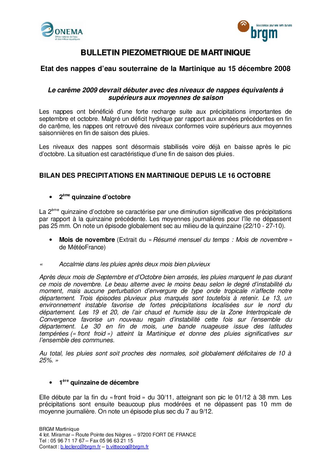 Ce bulletin correspond à la situation des nappes de la Martinique au 15 décembre 2008.