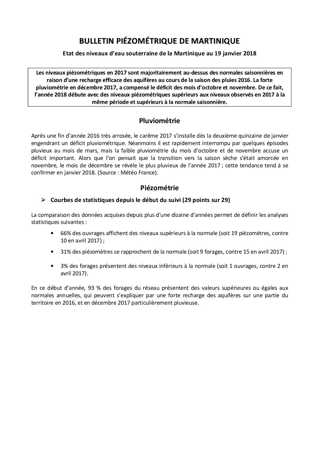 Bulletin piézométrique : Etat des niveaux d’eau souterraine de la Martinique au 19 janvier 2018.