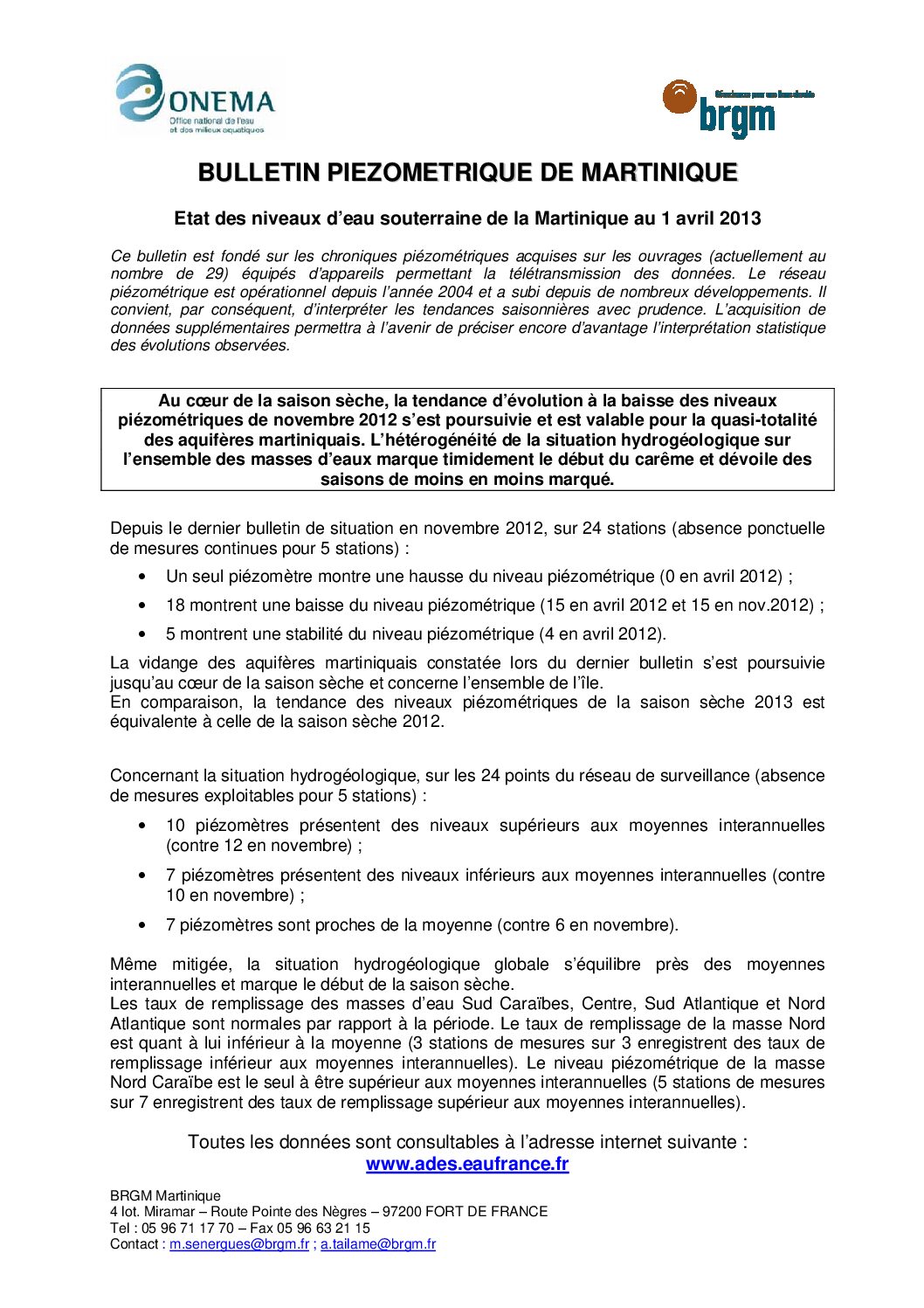 Bulletin piézométrique : Etat des niveaux d’eau souterraine de la Martinique au 1er mars 2013