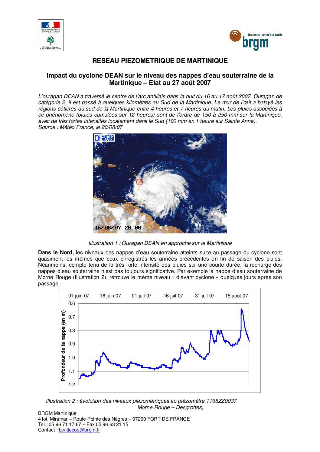 Globalement, ces fortes pluies associées au cyclone DEAN ont contribué de façon significative à la remontée des niveaux piézométriques, notamment dans le Centre, sur la côte atlantique et dans le Sud de l’île.