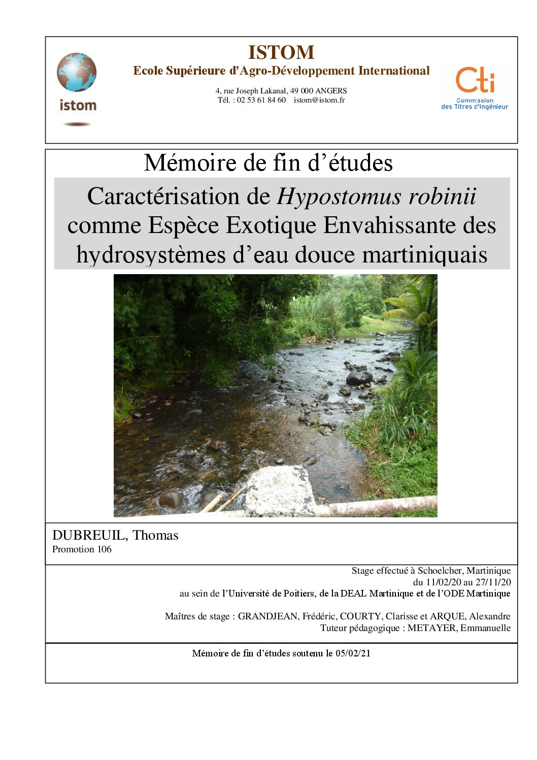 L’étude présentée dans ce rapport vise à définir le stade d’invasion de celui-ci dans son aire d’introduction qu’est la Martinique. Après séquençage du gène COI, l’espèce a été identifiée comme Hypostomus robinii (Valenciennes, 1840) mais d’autres espèces ont pu être introduites. Le protocole ADNe a permis de définir sa distribution et des pêches ont été effectuées pour estimer sa densité de population tout en améliorant les connaissances sur sa biologie et son écologie.