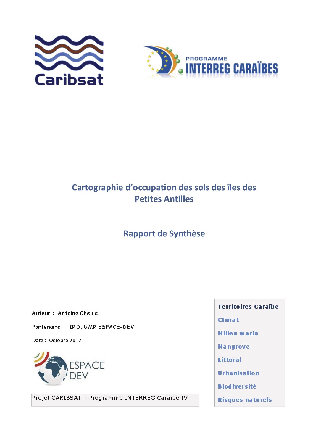 Dans le cadre du projet CARIBSAT, une carte d’occupation des sols à 10 mètres de résolution spatiale a été réalisée à l’échelle des petites Antilles. Elle constitue une base de données de départ pour des analyses thématiques plus spécifiques à l’échelle régionale. Elle fournit à la fois une information généraliste homogène et adaptée à l’ensemble des îles des Petites Antilles, et un référentiel cartographique s’insérant entre l’échelle globale et l’échelle locale. L’ensemble de l’information produite doit permettre d’alimenter des modèles d’observation de l’environnement, de préservation de la biodiversité, de gestion des risques naturels à l’échelle régionale.