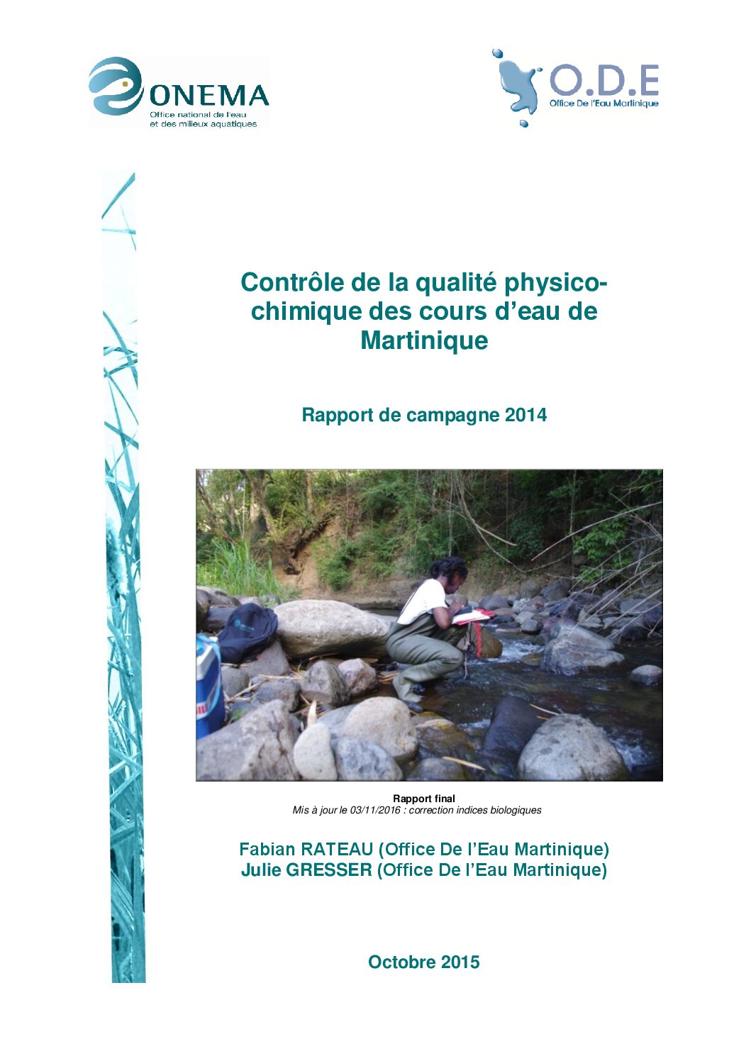 L’objet de ce rapport est de présenter les résultats du programme de surveillance de la qualité physico-chimique des cours d’eau mis en œuvre en 2014 par l’Office de l’Eau de la Martinique (ODE) en partenariat avec l’ONEMA.