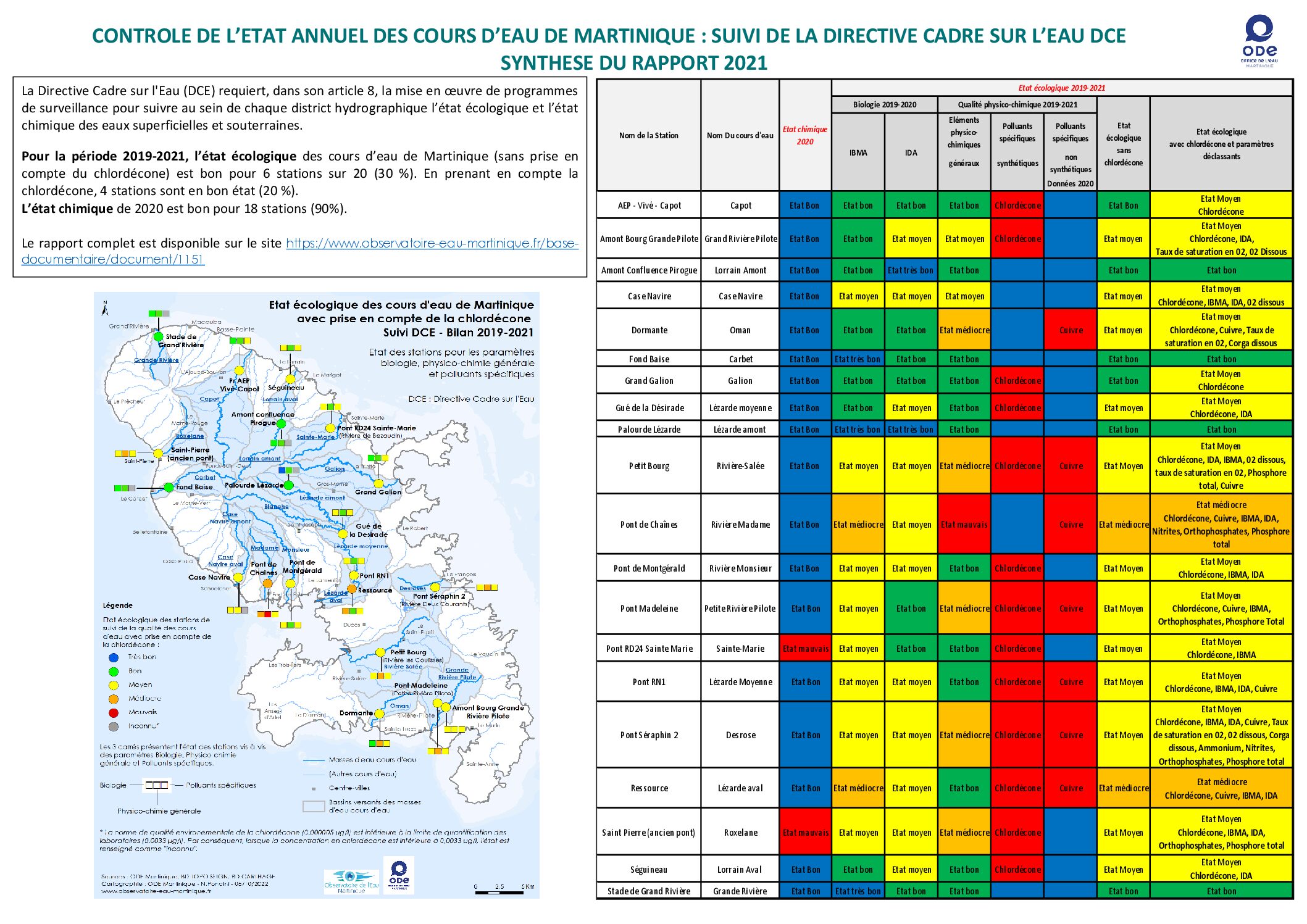 Pour la période 2019-2021, l’état écologique des cours d’eau de Martinique (sans prise en compte du chlordécone) est bon pour 6 stations sur 20 (30 %). En prenant en compte la chlordécone, 4 stations sont en bon état (20 %). L’état chimique de 2020 est bon pour 18 stations (90 %).