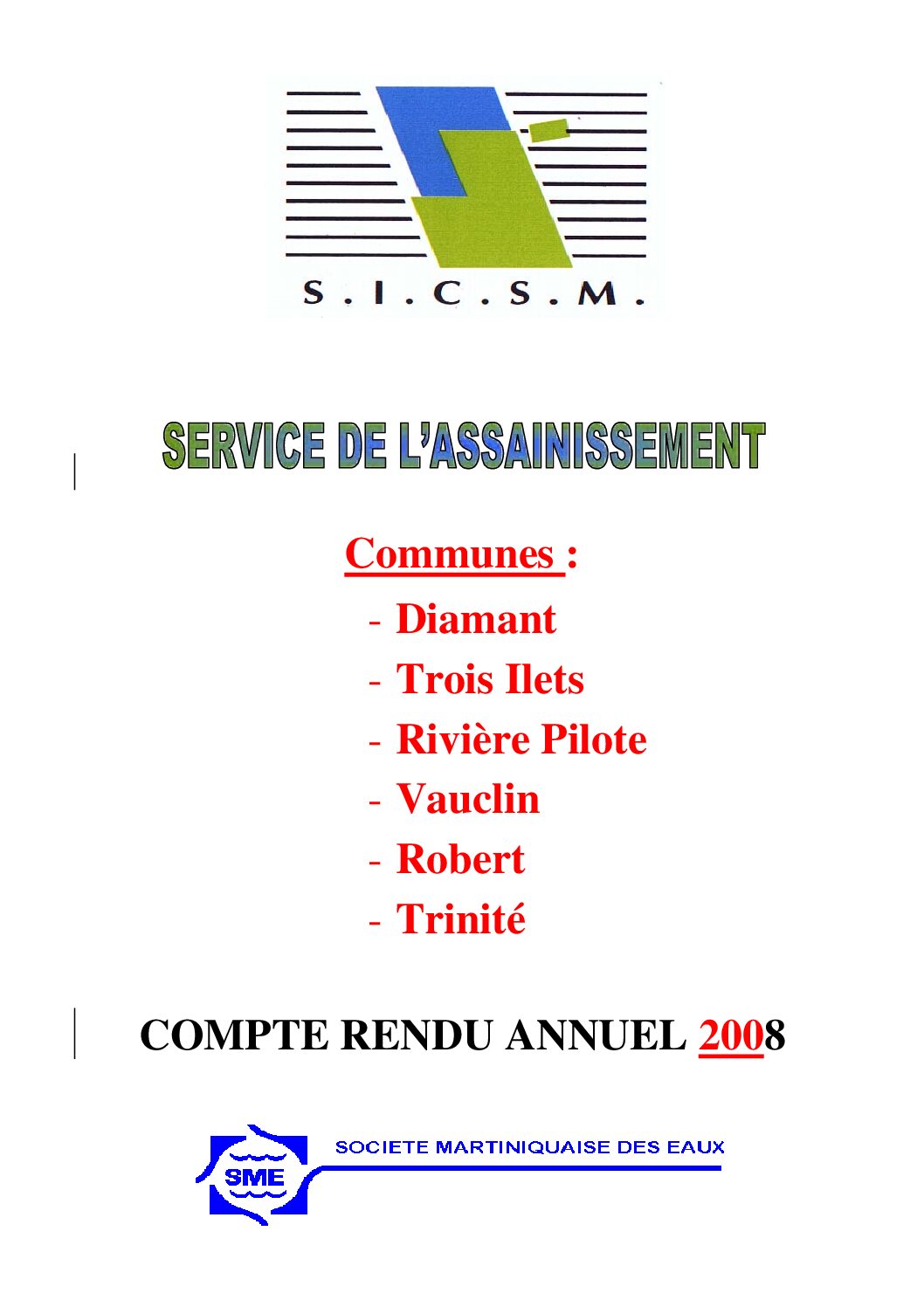 Le Compte Rendu Technique annuel du service public d’assainissement du SICSM, exercice 2008. 6 Communes : Le Diamant, Les Trois Ilets, Rivière Pilote, Le Vauclin, Le Robert et Trinité.