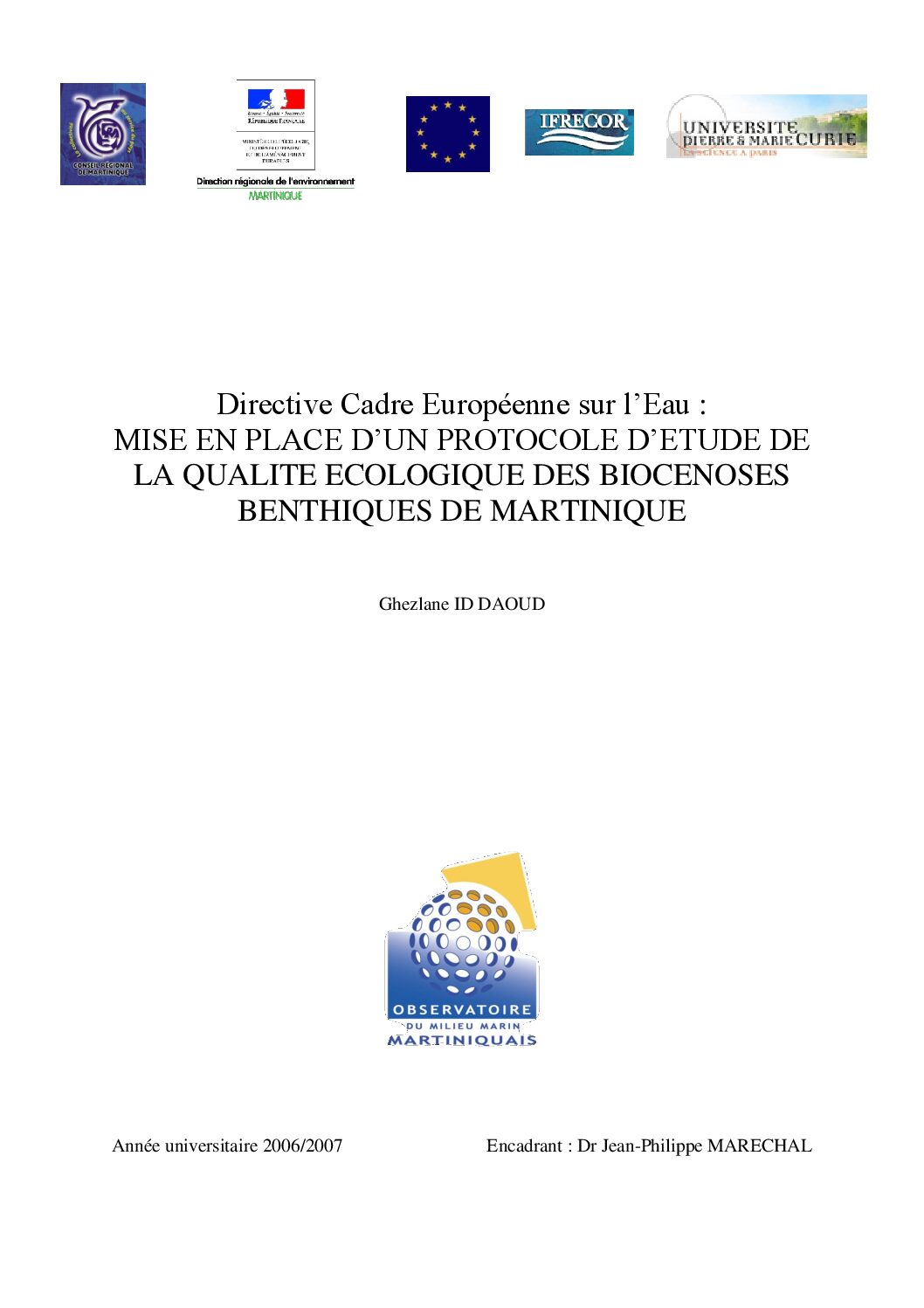 La Directive-Cadre Européenne sur l’Eau (DCE) établit un cadre pour la protection de l’ensemble des eaux européennes. Son principal objectif est l’atteinte du bon état écologique de toutes les masses d’eau d’ici 2015. Dans ce cadre, un protocole d’étude de la qualité écologique des biocénoses benthiques doit être mis en place. En Martinique, il s’agit d’adapter le protocole à un environnement tropical et de focaliser sur l’étude des récifs coralliens et des herbiers. Seule l’étude des récifs coralliens a pu être mise en oeuvre et une méthode d’échantillonnage adéquate a été mise au point. L’échantillonnage du benthos récifal s’effectue sur 6 transects aléatoires positionnés sur une zone récifale homogène. La méthode point intercept a été retenue : les organismes situés tous les 20cm sous le transect sont identifiés. Une attention particulière est portée à la couverture du récif en macroalgues, certaines espèces pouvant être indicateur d’état de santé. Pour évaluer le taux de recouvrement en macroalgues, l’utilisation de quadrats de 25x25cm a été retenue. Le quadrat est positionné tous les mètres le long du transect et l’observateur estime visuellement la couverture algale du quadrat. Ce protocole est utilisé sur les sites de référence sélectionnés autour de l’île selon les critères de la Directive Cadre sur l’Eau. Son application est rapide, simple d’utilisation et accessible aux personnes non scientifiques. Enfin, la qualité écologique des récifs peut être déduite de la composition des communautés benthiques et des données d’abondance par groupe ou espèce.