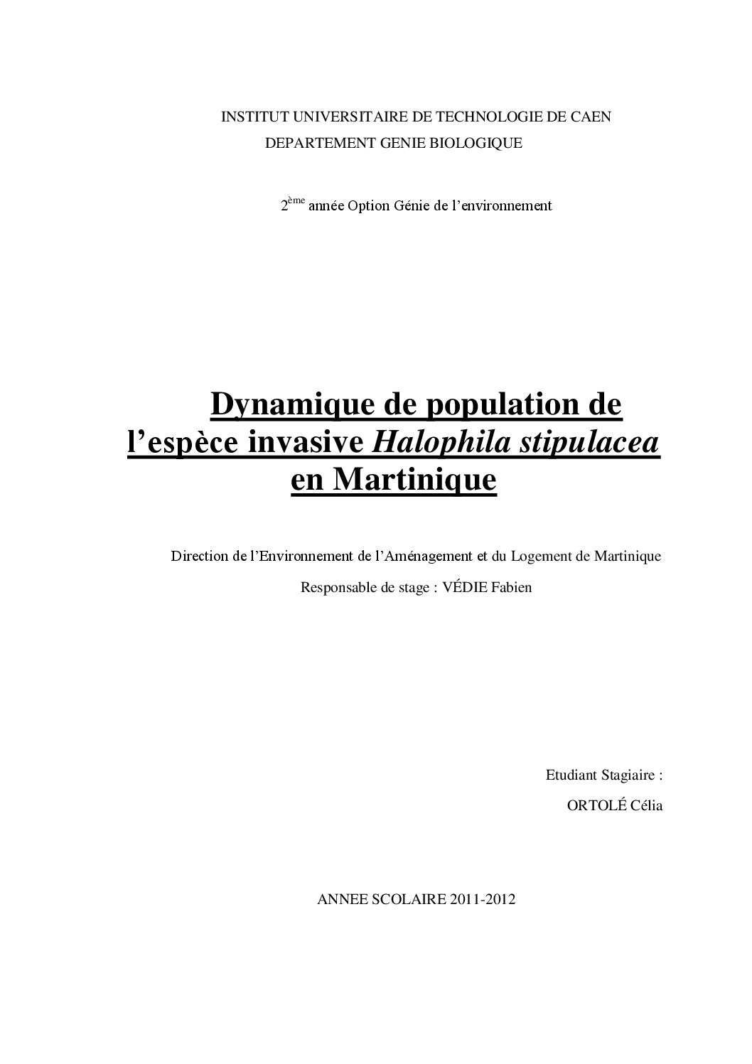 Ce rapport de stage documente l’étude et la cartographie d’Halophila stipulacea, une phanérogame marine invasive observée pour la première fois en Martinique en 2006. Originaire de la mer Rouge et de l’océan Indien, cette plante a été transportée via le canal de Suez jusqu’en Méditerranée, démontrant une forte capacité d’adaptation à différentes salinités et profondeurs. Atteignant les Petites Antilles, elle s’est répandue de la Grenade jusqu’en Martinique, où elle a remplacé les herbiers marins locaux, devenant une menace écologique majeure.