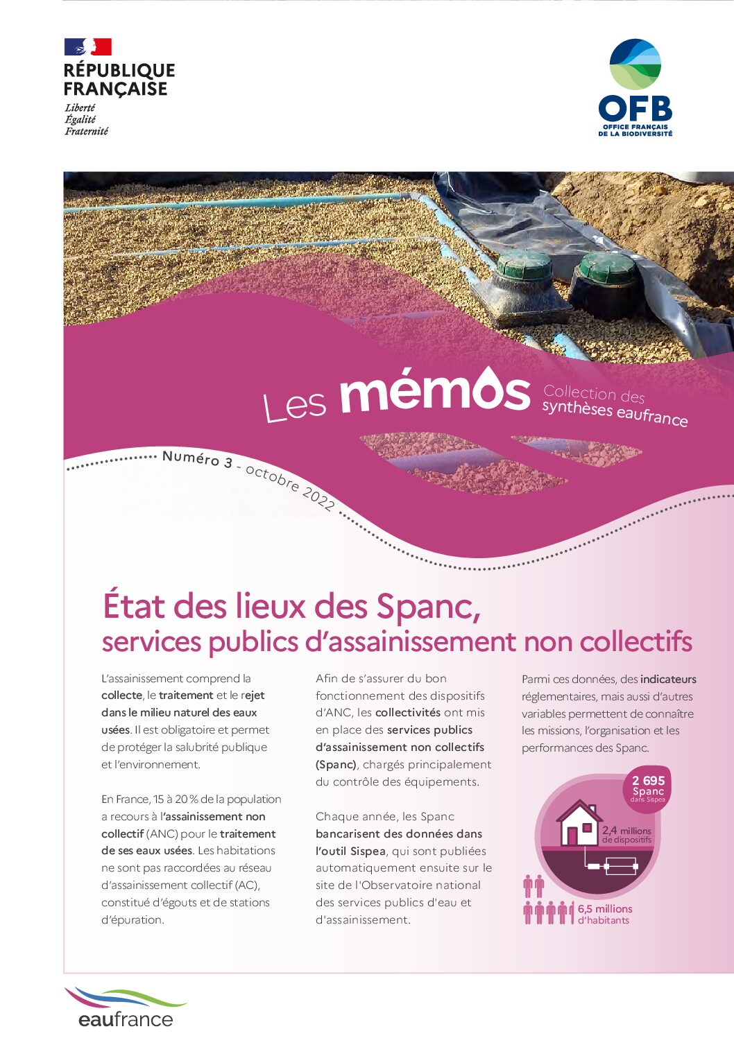 Afin de s’assurer du bon fonctionnement des dispositifs d’assainissement non collectif en France, les collectivités ont mis en place des services publics d’assainissement non collectifs, les Spanc, chargés principalement du contrôle des équipements. Chaque année, les Spanc bancarisent des données dans l’outil Sispea, qui sont ensuite publiées sur le site de l’Observatoire national des services publics d’eau et d’assainissement. Ce 3ème numéro des mémOs présente certains indicateurs et variables afin de mieux connaître les missions, l’organisation et les performances des Spanc.