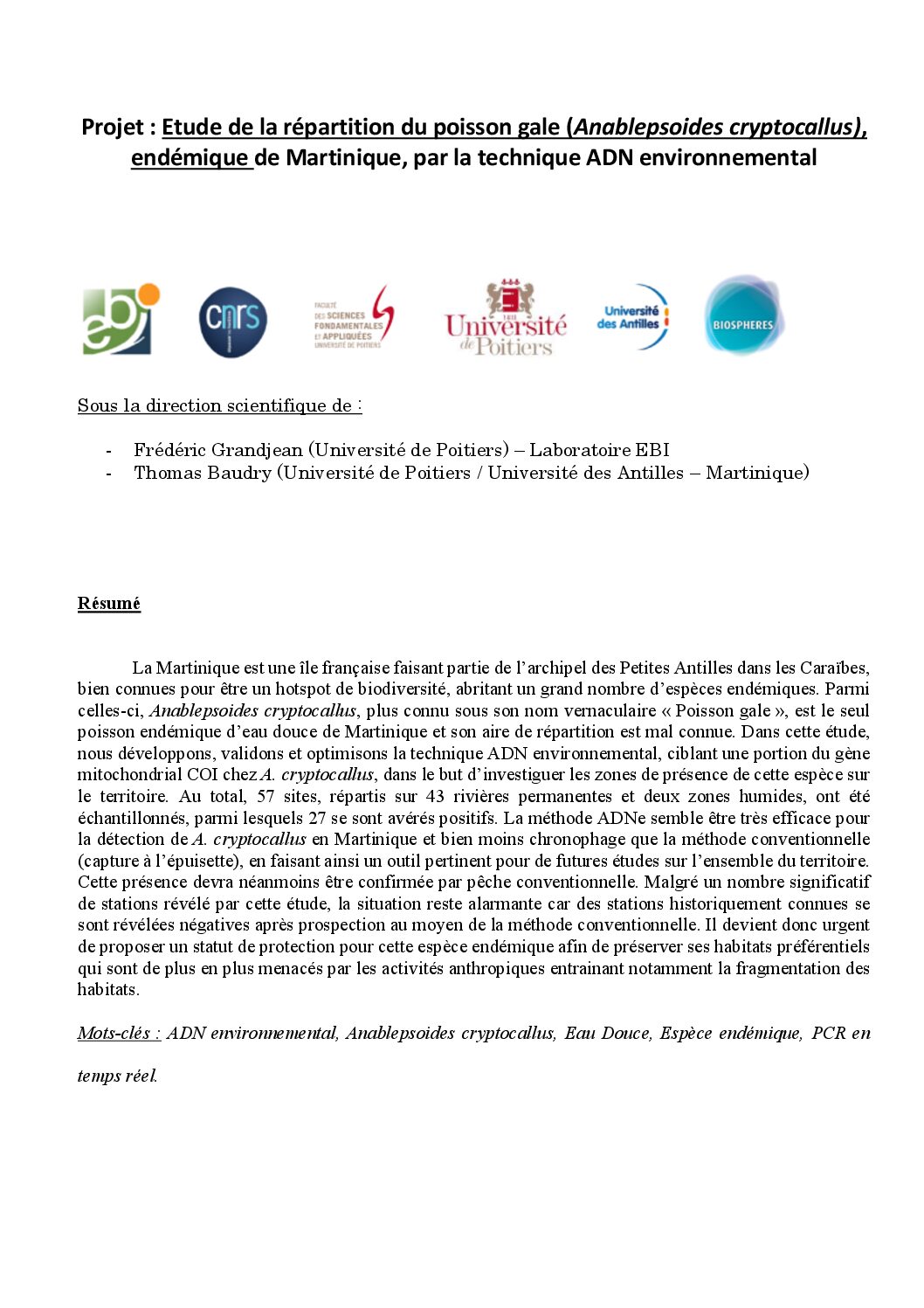 La Martinique est une île française faisant partie de l’archipel des Petites Antilles dans les Caraïbes, bien connues pour être un hotspot de biodiversité, abritant un grand nombre d’espèces endémiques. Parmi celles-ci, Anablepsoides cryptocallus, plus connu sous son nom vernaculaire « Poisson gale », est le seul poisson endémique d’eau douce de Martinique et son aire de répartition est mal connue. Dans cette étude, nous développons, validons et optimisons la technique ADN environnemental, ciblant une portion du gène mitochondrial COI chez A. cryptocallus, dans le but d’investiguer les zones de présence de cette espèce sur le territoire. Au total, 57 sites, répartis sur 43 rivières permanentes et deux zones humides, ont été échantillonnés, parmi lesquels 27 se sont avérés positifs. La méthode ADNe semble être très efficace pour la détection de A. cryptocallus en Martinique et bien moins chronophage que la méthode conventionnelle (capture à l’épuisette), en faisant ainsi un outil pertinent pour de futures études sur l’ensemble du territoire. Cette présence devra néanmoins être confirmée par pêche conventionnelle. Malgré un nombre significatif de stations révélé par cette étude, la situation reste alarmante car des stations historiquement connues se sont révélées négatives après prospection au moyen de la méthode conventionnelle. Il devient donc urgent de proposer un statut de protection pour cette espèce endémique afin de préserver ses habitats préférentiels qui sont de plus en plus menacés par les activités anthropiques entrainant notamment la fragmentation des habitats.