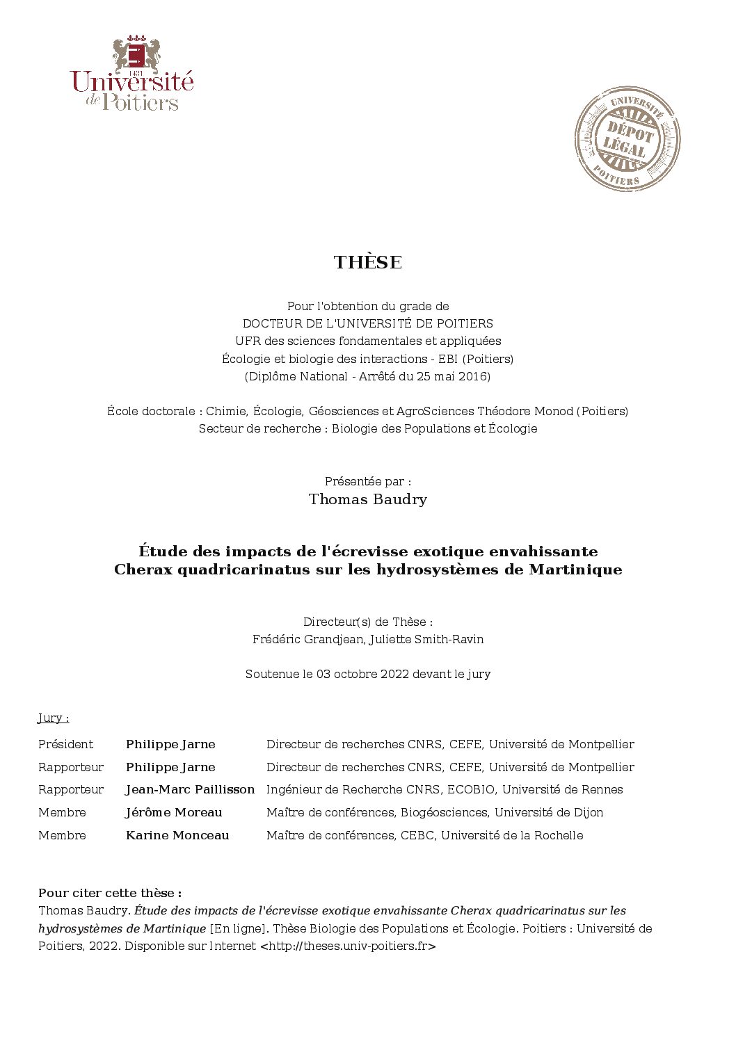 Le nombre d’invasions biologiques détectées dans le monde est en constante augmentation, en raison de la mondialisation. Les écrevisses, utilisées en aquaculture et très appréciées en aquariophilie, sont une belle illustration de ce phénomène. Parmi elles, l’écrevisse bleue Cherax quadricarinatus, d’origine australienne, est une espèce phare en aquaculture, en milieu tropical. De ce fait, elle a été transloquée dans de nombreux pays à travers le monde, dont la Martinique, où elle a été introduite au début des années 2000, pour redynamiser le secteur aquacole. Vendue vivante et très appréciée par les locaux, elle a été relâchée dans les rivières et a commencé à coloniser des bassins versants entiers, sans pour autant connaître précisément sa distribution. La Martinique est un territoire insulaire, appartenant à l’un des hotspots de biodiversité les plus riches du monde et les conséquences d’une telle invasion sur l’écosystème et les communautés locales doivent être appréhendées. Le développement de la technique ADN environnemental a permis, dans un premier temps, de préciser son aire de répartition. Parmi les 90 sites inventoriés, répartis sur 53 cours d’eau (parmi les 60 permanents de Martinique), l’écrevisse a été détectée sur 23 rivières. L’étude de la diversité génétique a révélé l’existence de plusieurs haplotypes, provenant probablement de plusieurs événements d’introduction. L’analyse des isotopes stables (ici azote 15N et carbone 13C) de la chaine trophique, a permis de caractériser les impacts de C. quadricarinatus sur les communautés locales : il semblerait que l’écrevisse occupe une place plutôt basse dans la niche trophique, caractérisant un régime alimentaire omnivore, à tendance herbivore. Des changements ontogénétiques ont également été observés, avec une alimentation différente selon les différents stades de vie. Les comparaisons des structures de niche trophique entre les zones envahies et les zones non-envahies ont montré un impact significatif sur les espèces de crevettes autochtones, par un phénomène d’exclusion compétitive. Aux vus de sa forte propagation depuis son introduction, la lutte contre cette espèce exotique envahissante parait compliquée. La pêche intensive ne peut régler cet épineux problème d’autant plus, que le contexte écotoxicologique local rend cette pratique non recommandable. En effet, les rivières Martiniquaises sont contaminées par le chlordécone, un pesticide largement utilisé jusqu’en 1993 dans les Antilles Françaises, provoquant l’interdiction de la pêche en rivière, par arrêté préfectoral. Nos expériences menées ont montré des taux de chlordécone importants dans les tissus abdominaux des écrevisses, dépassant largement les limites maximales fixées par l’Agence Régionale de Santé. Des expériences de décontamination de ces produits de pêche ont été menées, mais ceci ne semble pas être une alternative suffisamment efficace.
