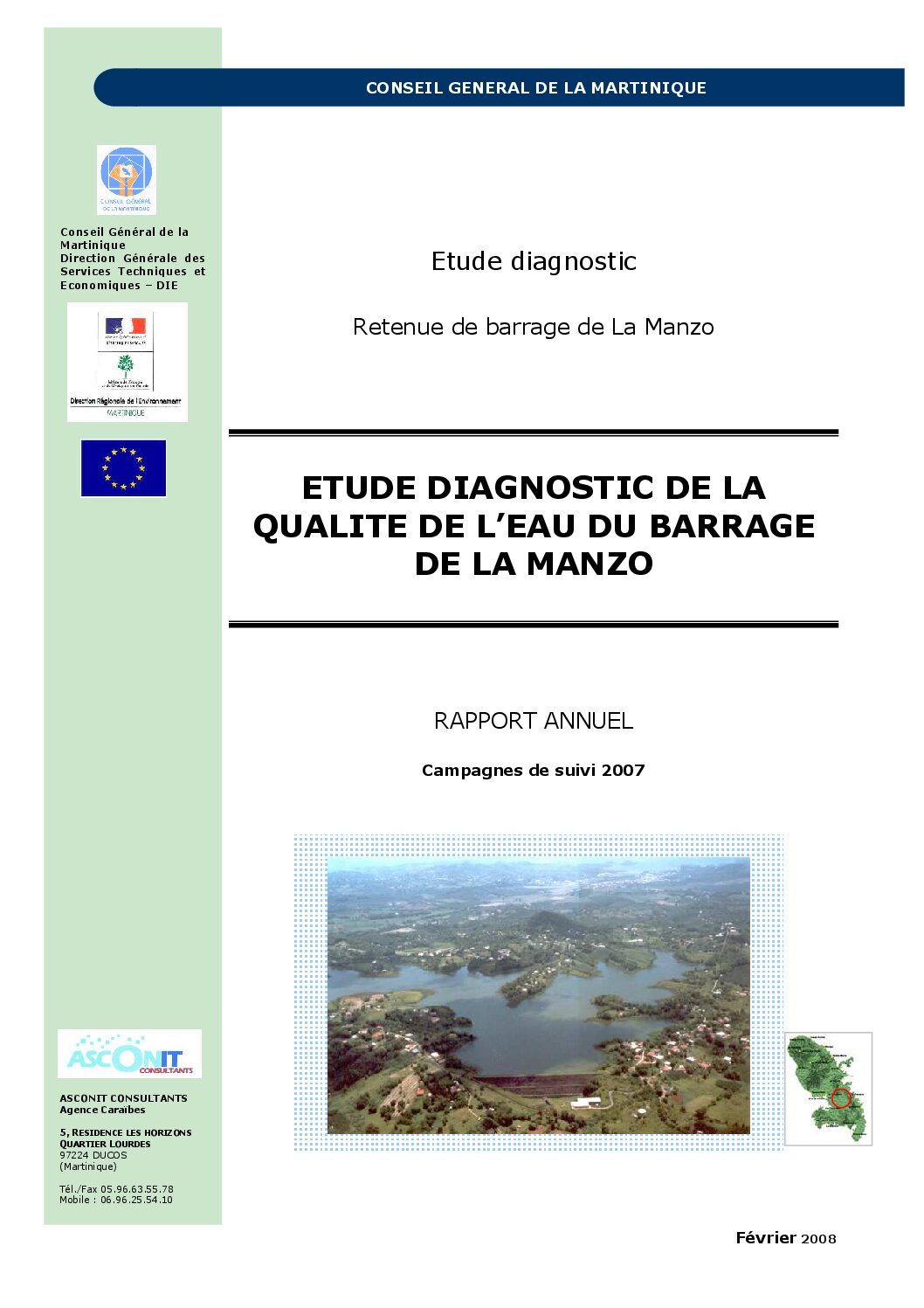 Le présent rapport d’étude s’inscrit dans le cadre du suivi de la qualité des eaux et de la définition des pistes de gestion de la retenue de barrage de Saint-Pierre la Manzo, en cohérence avec la mise en oeuvre de la Directive Cadre européenne sur l’Eau (DCE) 2000/60/CE du Parlement européen et du Conseil, du 23 octobre 2000. La maîtrise d’ouvrage de cette étude est assurée par le Conseil Général de la Martinique. Ces dernières années, la retenue de la Manzo est affectée, de manière récurrente, avec plus ou moins d’intensité, par une prolifération de microalgues donnant une coloration verte à l’eau. La présence de ces algues est le signe d’une eutrophisation de l’eau de la Manzo. C’est dans ce contexte que le Département s’est engagé à mener des investigations visant à répondre à un certain nombre d’interrogations portant sur :
