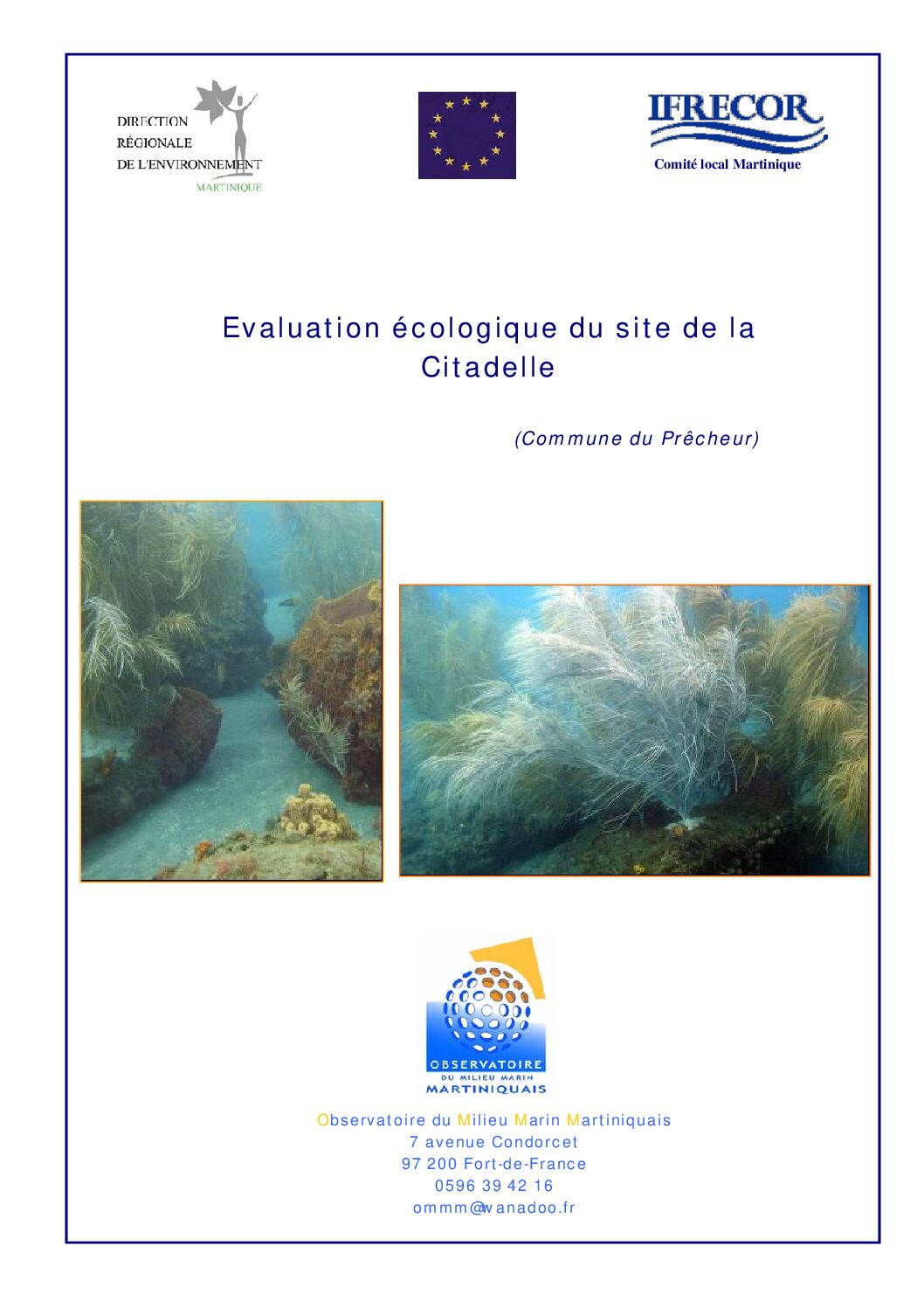 Plusieurs projets visant la mise en place de mesures particulières de gestion sur des aires marines sont actuellement à l’étude en Martinique. Dans le cadre de ces programmes IFRECOR, l’OMMM a été chargé de réaliser une évaluation de l’intérêt écologique de deux régions marines : le lieu dit de la Citadelle (commune de Prêcheur) et l’ensemble de la région marine allant du Cap Férré à la pointe Baham. Ce travail ne concerne que le site de la Citadelle. L’évaluation de la deuxième zone donnera lieu à un travail ultérieur.