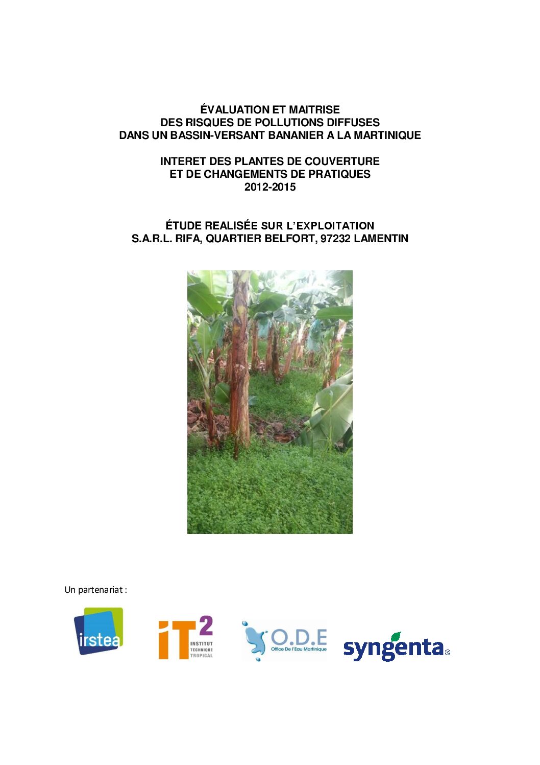 Le projet Agéris RIFA conduit sur trois années a consisté à mesurer l’impact des changements de pratiques culturales sur les risques d’entraînement de produits phytosanitaires par ruissellement et érosion au sein d’un petit bassin-versant bananier martiniquais. Les mesures présentées ici portent sur l’année de référence et l’année suivant l’implantation de plantes de couverture (petit mouron), sur une partie des deux pentes du bassin versant et l’arrêt quasi total du désherbage à proximité de la ravine. L‘installation d’une station hydrologique et de prélèvement d’échantillons d’eau à l’exutoire du bassin versant a permis de suivre et d’évaluer les teneurs en substances actives présentes dans l’eau brute à l’exutoire et d’évaluer les flux de substances actives utilisées sur l’exploitation avant et après aménagement et changements de pratiques. Les résultats montrent un réel intérêt des plantes de couverture sur la diminution des pics de pollution et la réduction très nette des transferts vers l’eau de substances actives herbicides sans que ceci ne puisse être lié à la réduction de phénomènes érosifs mais plutôt à une diminution du ruissellement. Pour les fongicides, il a été montré que les plantes de couverture ont fortement contribué à faire baisser les transferts. En effet, le flux exporté a été divisé par 3 alors que la dose de triazoles totale apportée a été multipliée par près de 2 du fait des modifications du programme fongicides consécutif au changement de pratiques (passage d’une organisation aérienne planifiée à des traitements au sol gérés par l’exploitant). Du point de vue économique, il apparaît, dans le contexte de cette exploitation, une surcharge importante, hors coût d’implantation. Elle est principalement liée aux coûts élevés du maintien d’un état satisfaisant de la culture de couverture implantée dans le contexte pédoclimatique de cette exploitation.