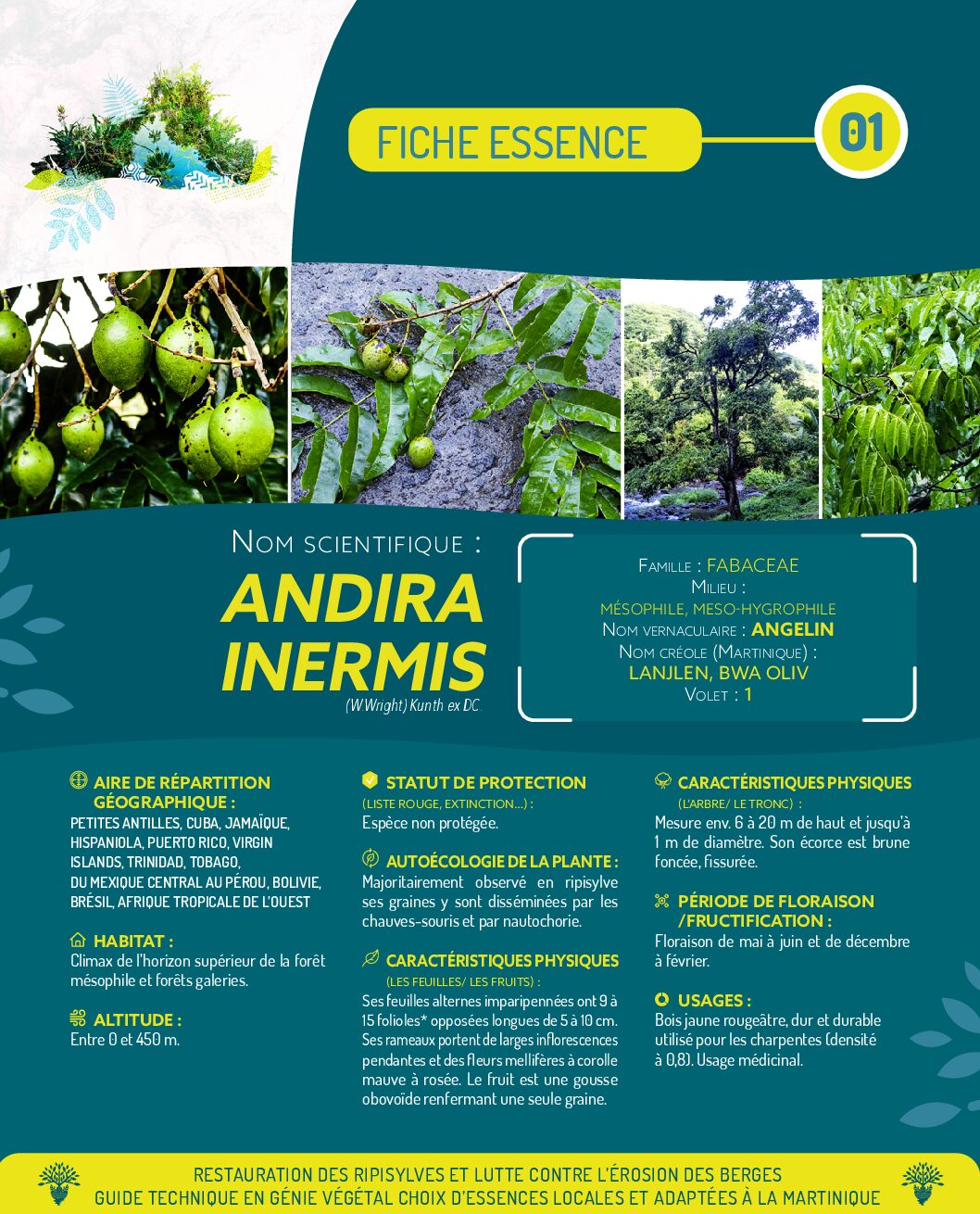 Ce guide technique est un ensemble de fiche consacré à la restauration des ripisylves et à la lutte contre l’érosion des berges, en se concentrant sur le choix d’essences locales et adaptées à la Martinique. Il détaille les caractéristiques, l’aire de répartition, l’habitat, le statut de protection, et l’autoécologie de diverses plantes, ainsi que leurs usages potentiels en génie végétal.