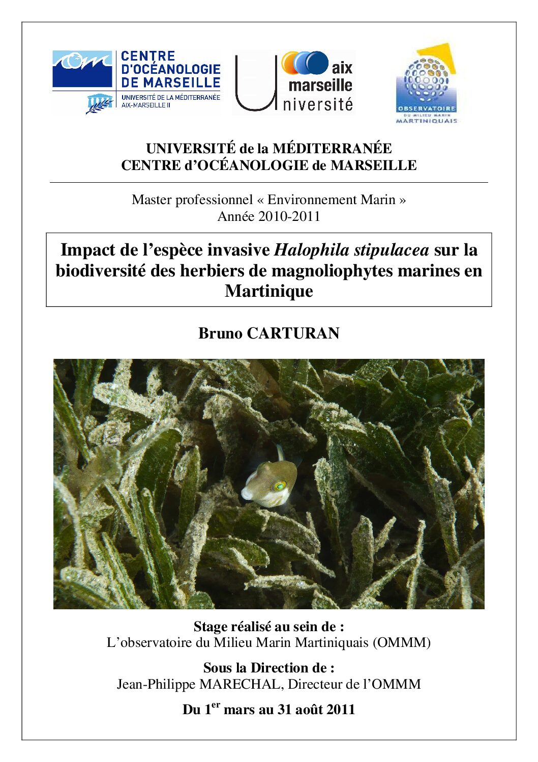 Les invasions biologiques sont en nette augmentation depuis ces dernières décennies, et sont considérées comme l’un des problèmes environnementaux majeurs du 21ème siècle. La magnoliophyte marine Halophila stipulacea, originaire de Mer Rouge, se propage dans la région Caraïbe depuis 2002 et a été recensée en 2006 sur la côté Ouest de la Martinique. À ce jour, aucune étude n’a été menée sur les impacts écologiques de cette prolifération. Ce travail de recherche constitue une première évaluation des différences entre les peuplements ichtyologiques et des macro-invertébrés des herbiers endémiques (dominés par Thalassia testudinum) et ceux des herbiers à H. stipulcea. Les données ont été récoltées grâce à un protocole d’échantillonnage spécialement élaboré pour cette étude. Les résultats ne montrent pas de différence significative entre les peuplements ichtyologiques des deux types d’herbiers : la richesse spécifique, la densité et le nombre d’herbivores et de juvéniles sont équivalents. Néanmoins certaines espèces comme Serranus baldwini seraient favorisées par la structure de l’habitat créé par H. stipulacea (canopée courte, dense et homogène). Les données obtenues sur les peuplements des macro-invertébrés ne permettent pas une analyse comparative rigoureuse entre les deux types d’herbiers. Des modifications du présent protocole et de protocoles alternatifs sont discutées dans ce rapport.