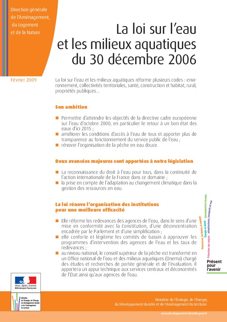 Ce document présente une synthèse de la loi sur l’eau et les milieux aquatiques du 30 décembre 2006.