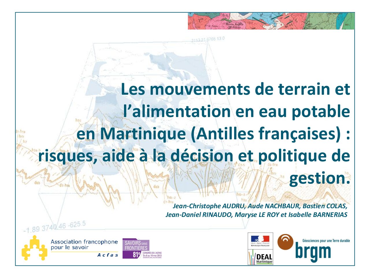 L’île de la Martinique (France) est une île volcanique de la Caraïbe, intensément exposée aux mouvements de terrain. Les phénomènes récents survenus en Martinique apportent de nouvelles informations sur ces aléas naturels et leurs conséquences sur la population, le bâti et les réseaux. Ces événements et les crises associées modifient également la perception des risques par les services de l’état et les élus. C’est ainsi que, par exemple, une nouvelle réflexion s’engage sur la vulnérabilité des infrastructures existantes (lignes de vie, réseaux routiers, édifices publics etc.) afin de planifier leurs impacts économiques. L’exemple choisi pour cette présentation concerne l’analyse de la vulnérabilité du réseau d’alimentation en eau potable de la Martinique vis-à-vis des glissements de terrain, pour prévenir un événement aussi catastrophique que celui qui avait paralysé l’alimentation d’une partie de l’île en 2009. L’organisation et la gouvernance du réseau sont abordées, ainsi que ses interactions avec les autres réseaux (électricité, routes, télécommunications). L’anticipation des éventuels impacts humains, économiques et financiers participera à identifier les secteurs les plus sensibles et à guider l’orientation de la politique de gestion de l’alimentation en eau potable en Martinique pour les prochaines années.