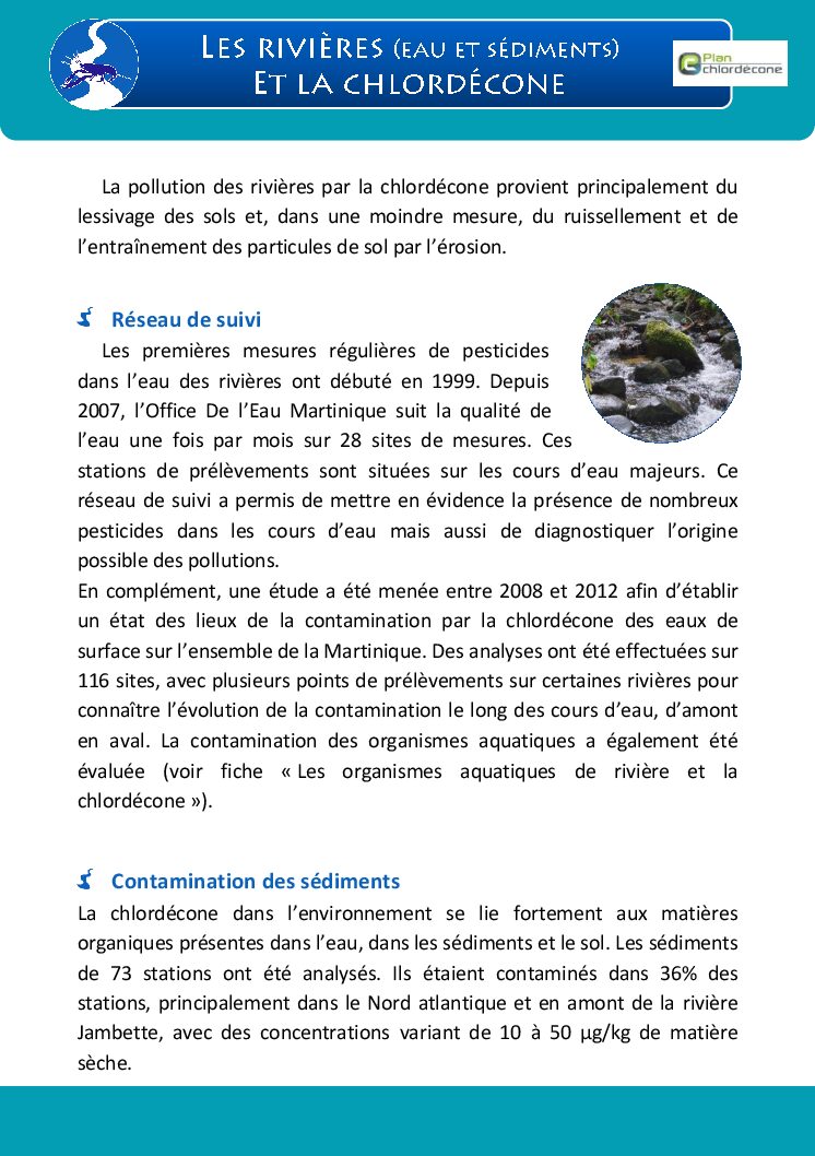 Fiche synthétique sur la pollution des rivières par la chlordécone en Martinique.