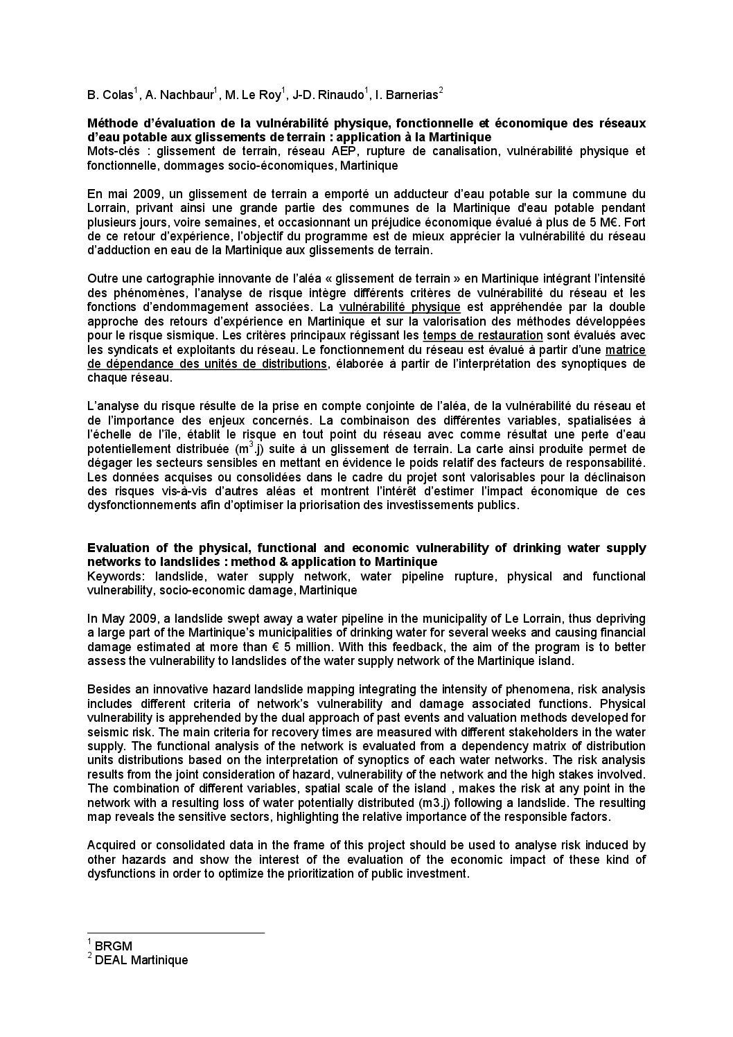 Outre une cartographie innovante de l’aléa « glissement de terrain » en Martinique intégrant l’intensité des phénomènes, l’analyse de risque intègre différents critères de vulnérabilité du réseau et les approche des retours d’expérience en Martinique et sur la valorisation des méthodes développées pour le risque sismique. Les critères principaux régissant les temps de restauration sont évalués avec les syndicats et exploitants du réseau. Le fonctionnement du réseau est évalué à partir d’une matrice de dépendance des unités de distributions, élaborée à partir de l’interprétation des synoptiques de chaque réseau.