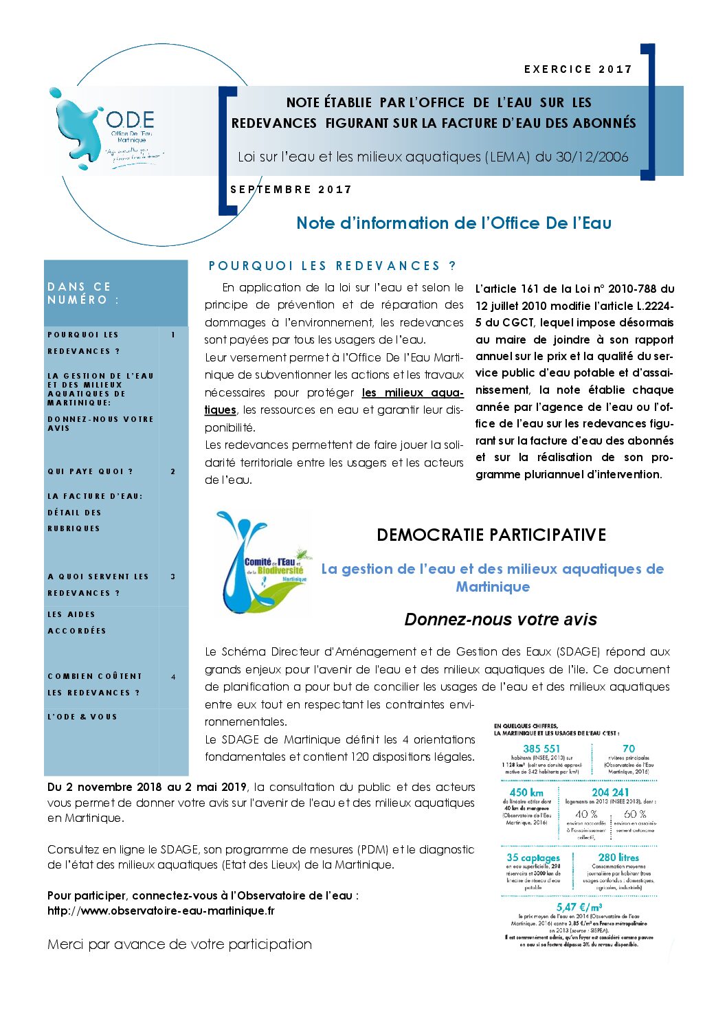 Note d’information établie par l’Office de l’Eau Martinique sur les redevances figurant sur la facture d’eau des abonnés au titre de l’exercice 2017.