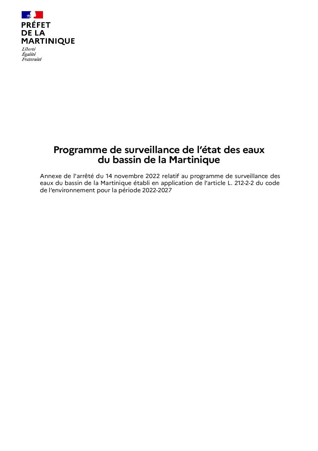 Le contenu de ce programme est fixé par l’arrêté préfectoral du 14 novembre 2022 relatif au programme de surveillance des eaux du bassin de la Martinique établi en application de l’article L. 212-2-2 du code de l’environnement.