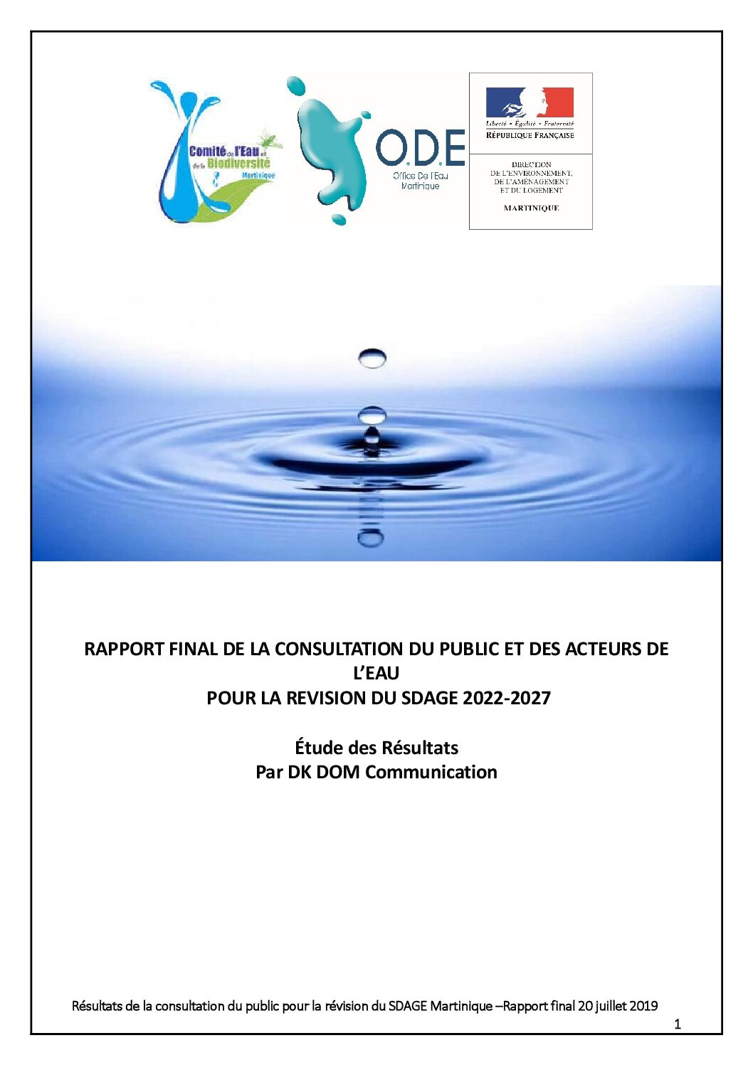Ce rapport présente les résultats de la consultation du public et des acteurs de l’eau pour la révision du Schéma Directeur d’Aménagement et de Gestion des Eaux (SDAGE) de Martinique, qui s’est déroulée du du 2 novembre 2018 au 2 mai 2019.