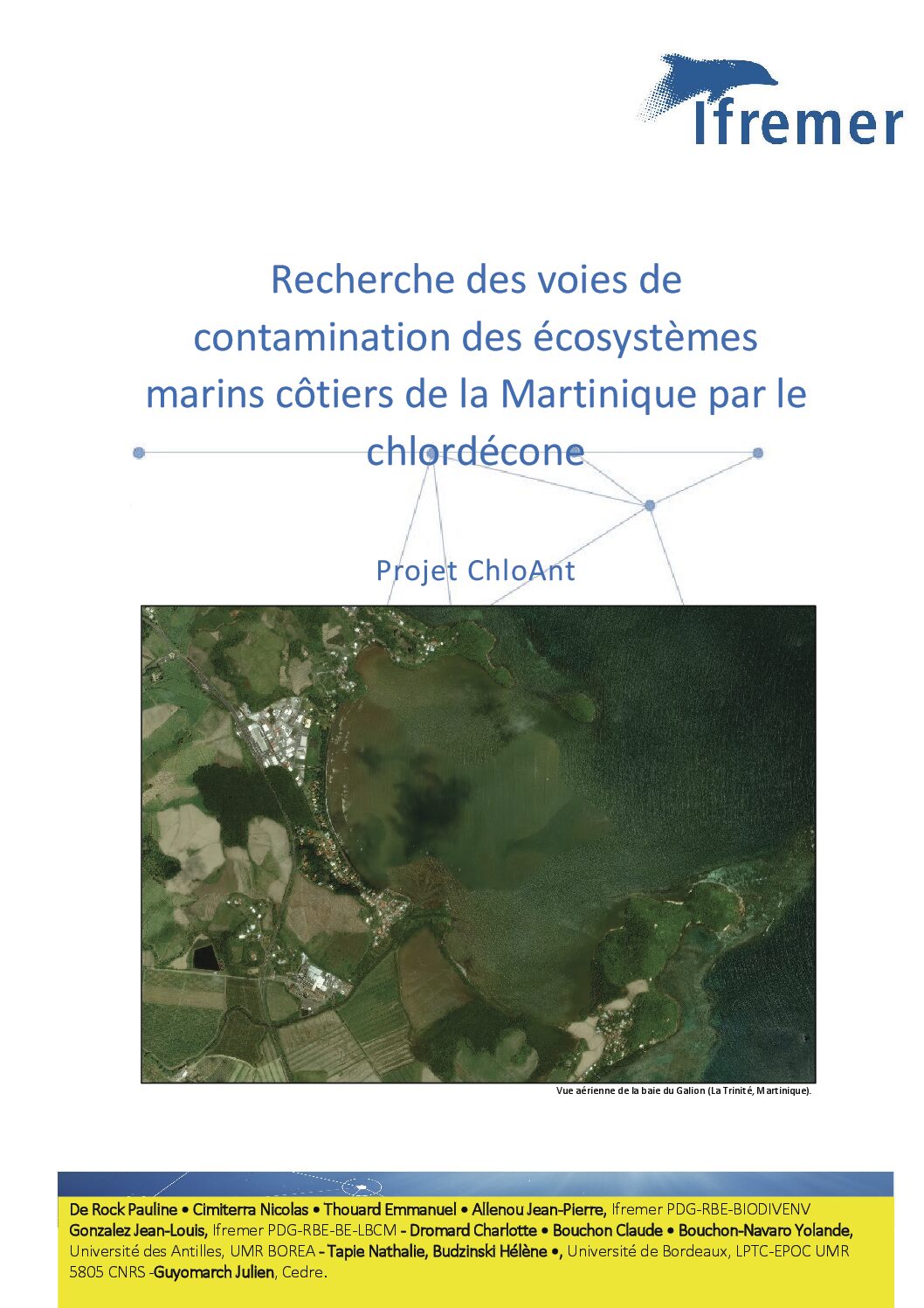 Le projet ChloAnt a pour objectif l’amélioration des connaissances sur les voies de contamination des écosystèmes côtiers par le chlordécone (CLD). L’étude a été réalisée sur le site pilote de la Baie du Galion en Martinique connu pour sa forte exposition au CLD. Le premier volet a consisté à suivre pendant une année les concentrations en CLD en rivière sur une station, et en mer, sur trois stations situées sur une radiale côte-large. Dans un premier temps, la méthodologie des échantillonneurs passifs intégratifs (EPI) a été mise en oeuvre pour le dosage des plus faibles concentrations en mer. Dans le deuxième volet, la contamination en CLD a été mesurée dans les différents maillons de la chaîne trophique et sur les trois écosystèmes côtiers: mangrove, herbier et récif. L’échantillonnage a été réalisé en saison sèche et en saison humide pour étudier la saisonnalité de la contamination en lien avec les apports du bassin versant. Les résultats ont mis en évidence une forte variabilité des flux de CLD liée principalement au débit de la rivière. La contamination du milieu ambiant et de la faune marine suivent un gradient décroissant depuis la côte vers le large. L’étude de la saisonnalité met en évidence des situations contrastées selon les écosystèmes et les espèces, aucune tendance générale ne ressort. Enfin, les résultats des analyses isotopiques réalisées sur les différents maillons trophiques confirment les deux modes de contamination de la faune marine. Le premier résulte des variations du niveau de contamination ambiant, il s’agit d’une contamination par « bain ». Le deuxième phénomène est une contamination par voie trophique. Ces deux phénomènes opèrent dans les trois stations mais varient en intensité selon le site et selon la saison.