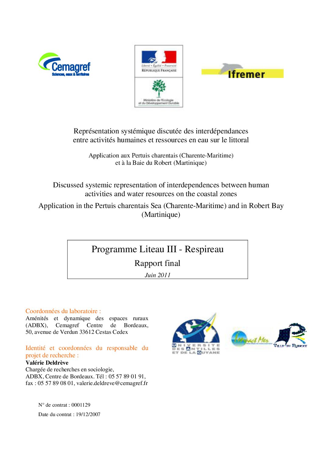 Martinique (et leurs espaces terrestres associés), notre équipe de recherche a défini les enjeux de l’eau du point de vue des acteurs, c’est-à-dire en tant qu’enjeux de territoire spécifiques. Puis elle a établi une représentation systémique des interactions entre certaines activités humaines et les milieux naturels, à partir de la problématique de la qualité de l’eau. Une représentation cartographiée des indicateurs de vulnérabilité à l’érosion, du modèle DPSIR et des scénarios (d’évolution de l’état qualitatif de la baie) ont ainsi été produits pour la baie du Robert. Dans les Pertuis, le cadre logique du Millenium Ecosystem Assessment (MEA) a été choisi pour rendre compte des interdépendances et intégrer quatre entrées par les usages de l’eau : une approche du service de la pêche à pied, auquel une valeur économique a été attribuée, une lecture écologique du MEA appliquée à la conchyliculture, une évaluation