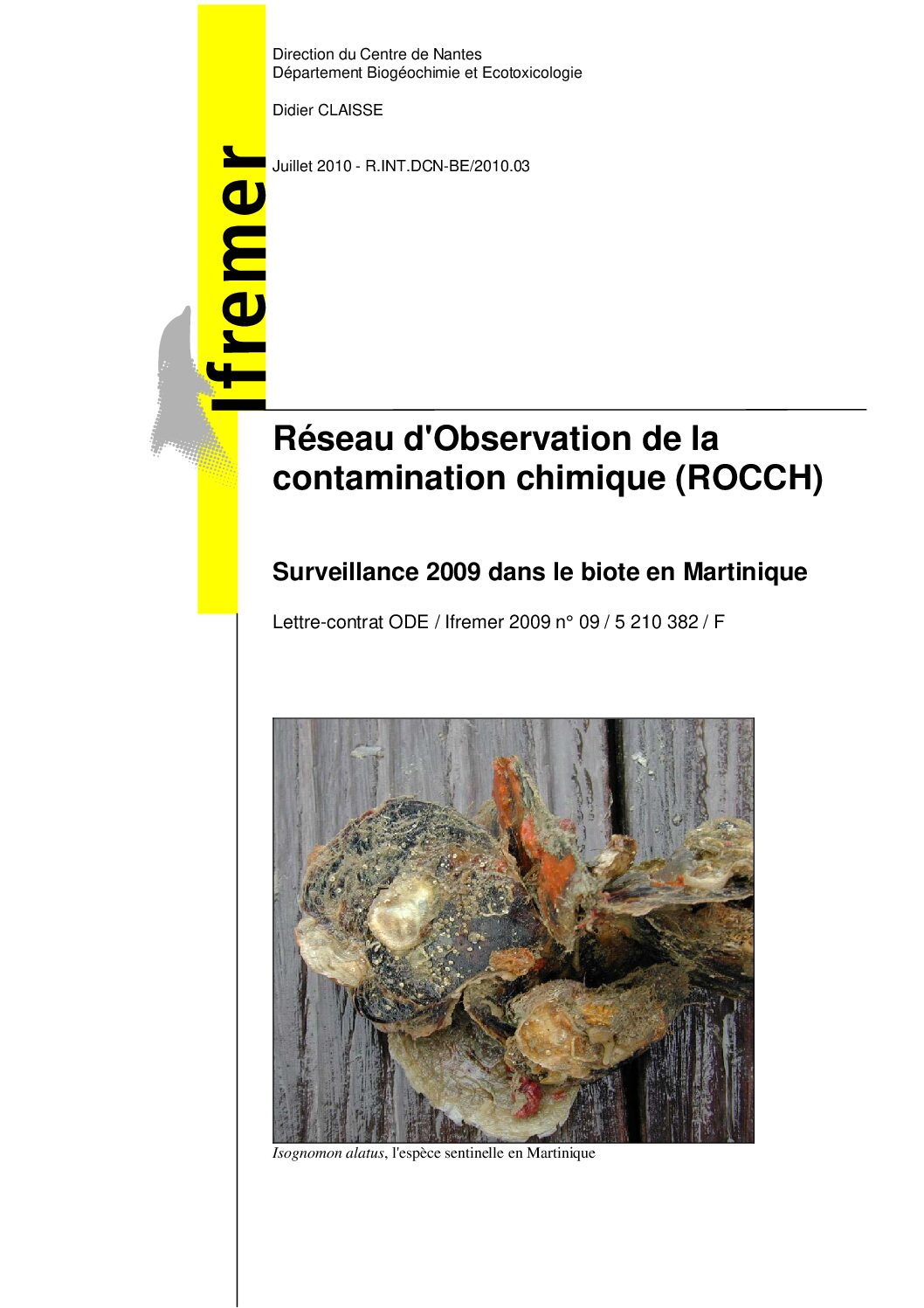 Ce rapport présente les actions menées et les résultats acquis en 2009 dans le cadre de la surveillance chimique du ROCCH (Réseau d’Observation de la Contamination chimique) en Martinique.