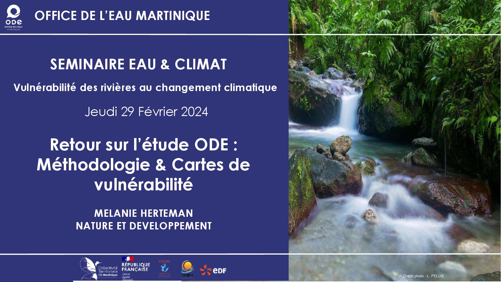 Présentation de Mélanie Herteman pour le séminaire “Eau & Climat” du 29 février 2024, traitant de la vulnérabilité des rivières martiniquaises au changement climatique. Il aborde l’étude réalisée par l’Office de l’Eau Martinique, examinant les modifications climatiques, leurs conséquences sociales, environnementales et économiques, et met l’accent sur l’adaptation et l’anticipation face à ces défis. La présentation met en lumière les priorités d’adaptation au changement climatique et propose une méthodologie pour évaluer la vulnérabilité des cours d’eau, en s’appuyant sur des ateliers de travail et des ateliers participatifs pour élaborer un plan d’action concerté.