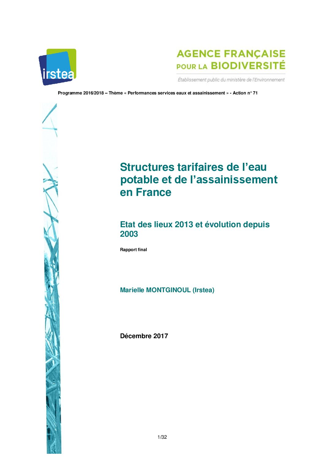 Le prix de l’eau est l’objet de débats. Souvent seul son niveau est analysé. Parfois il est question du poids représenté par la partie fixe dans la facture. Mais la facture d’eau ne se limite pas à ces seules dimensions. La structure de la tarification est beaucoup plus complexe et peut revêtir de formes très variées, indicatrices des objectifs qu’on cherche à lui assigner: équilibre budgétaire, incitation à l’économie d’eau, accès à l’eau pour tous. Ce rapport présente ces différentes structures, les principaux éléments législatifs qui en France les encadrent, la pratique actuelle et son évolution récente, en se basant sur une lecture de la législation française et sur deux enquêtes conduites auprès de communes en 2003 et 2013.