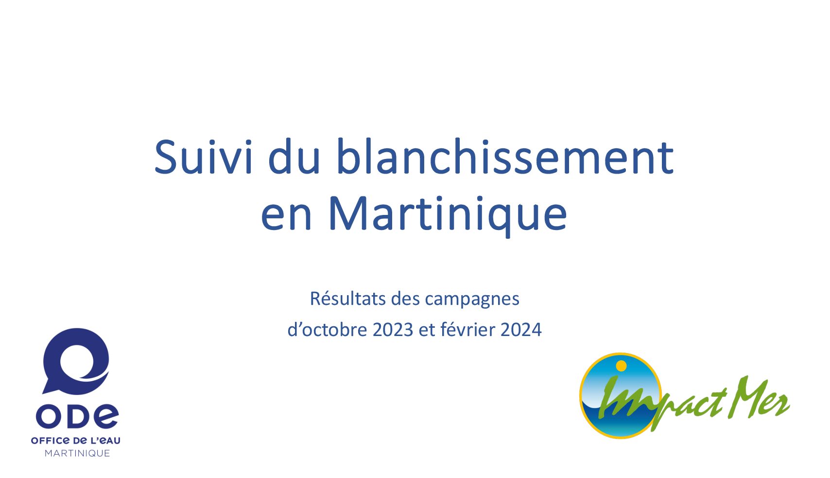 Ce document présente les résultats des campagnes de suivi du blanchissement des coraux de Martinique d’octobre 2023 et février 2024. Ces campagnes ont permis de mettre en évidence que le blanchissement a impacté 81% de la couverture corallienne et il a provoqué la perte de 34% de la couverture corallienne en Martinique.