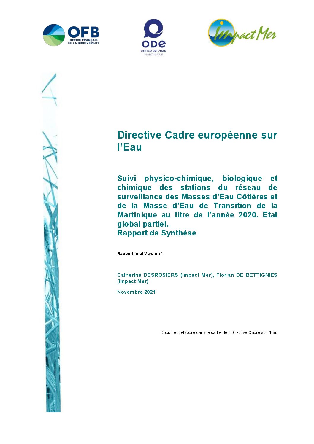 Elle s’inscrit dans la continuité des études DCE antérieures (Impact Mer, 2006, 2010-2012, 2014-2019) et de l’étude spécifique de 2011 sur le phytoplancton (CREOCEAN, 2015). Ce rapport présente les résultats de l’année 2020 et l’état global partiel calculé sur 6 années glissantes, soit de 2015 à 2020.