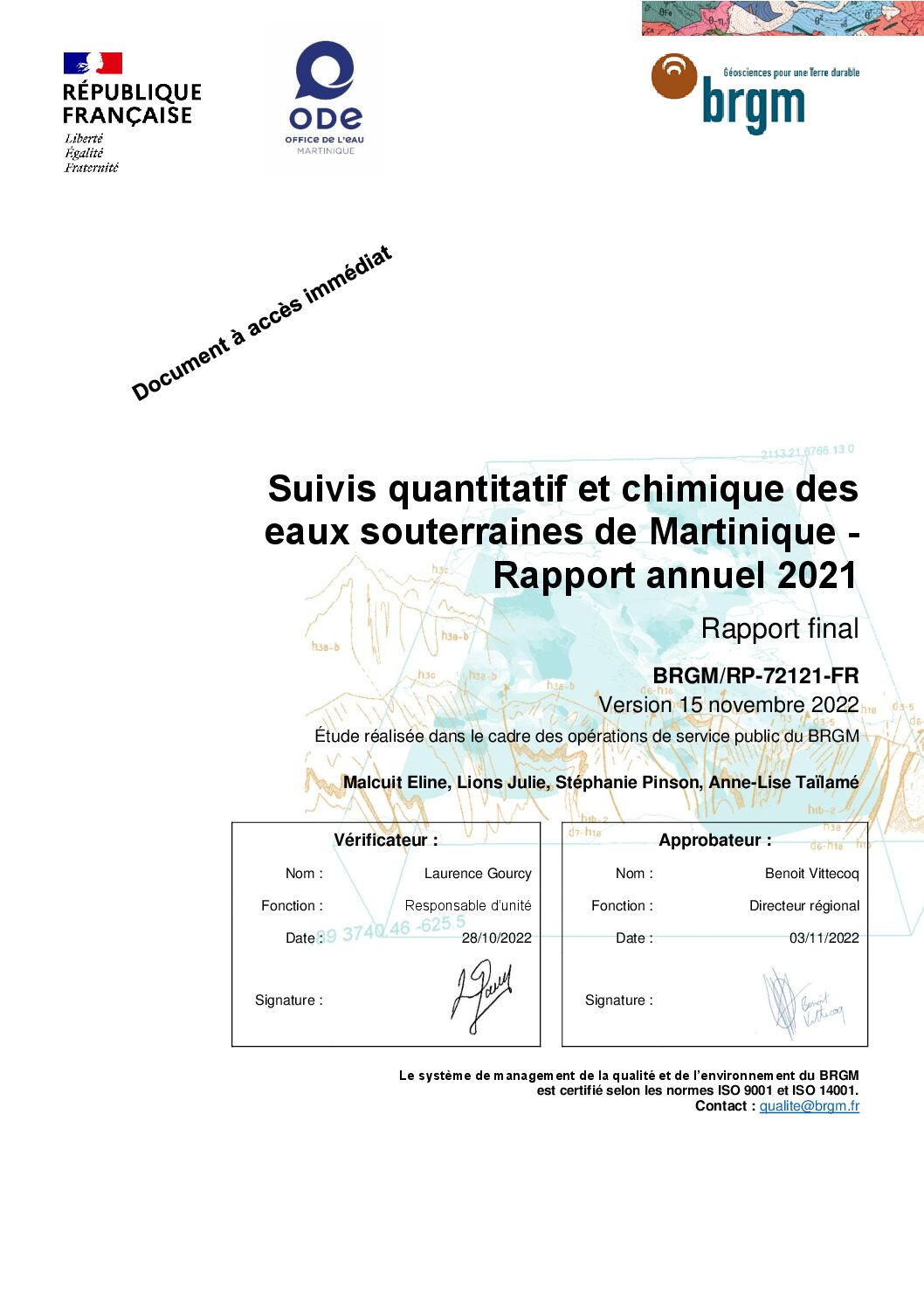 L’Office De l’Eau (ODE) et le BRGM cofinancent un programme de surveillance de la qualité des eaux souterraines de Martinique qui se traduit depuis 2008 par le suivi biannuel de 21 points au titre du contrôle de surveillance (RCS) et de 12 points (parmi les 21 du réseau de suivi qualitatif) au titre du contrôle opérationnel (RCO). Depuis décembre 2008, il est complété par un suivi mensuel sur 2 autres points de surveillance.