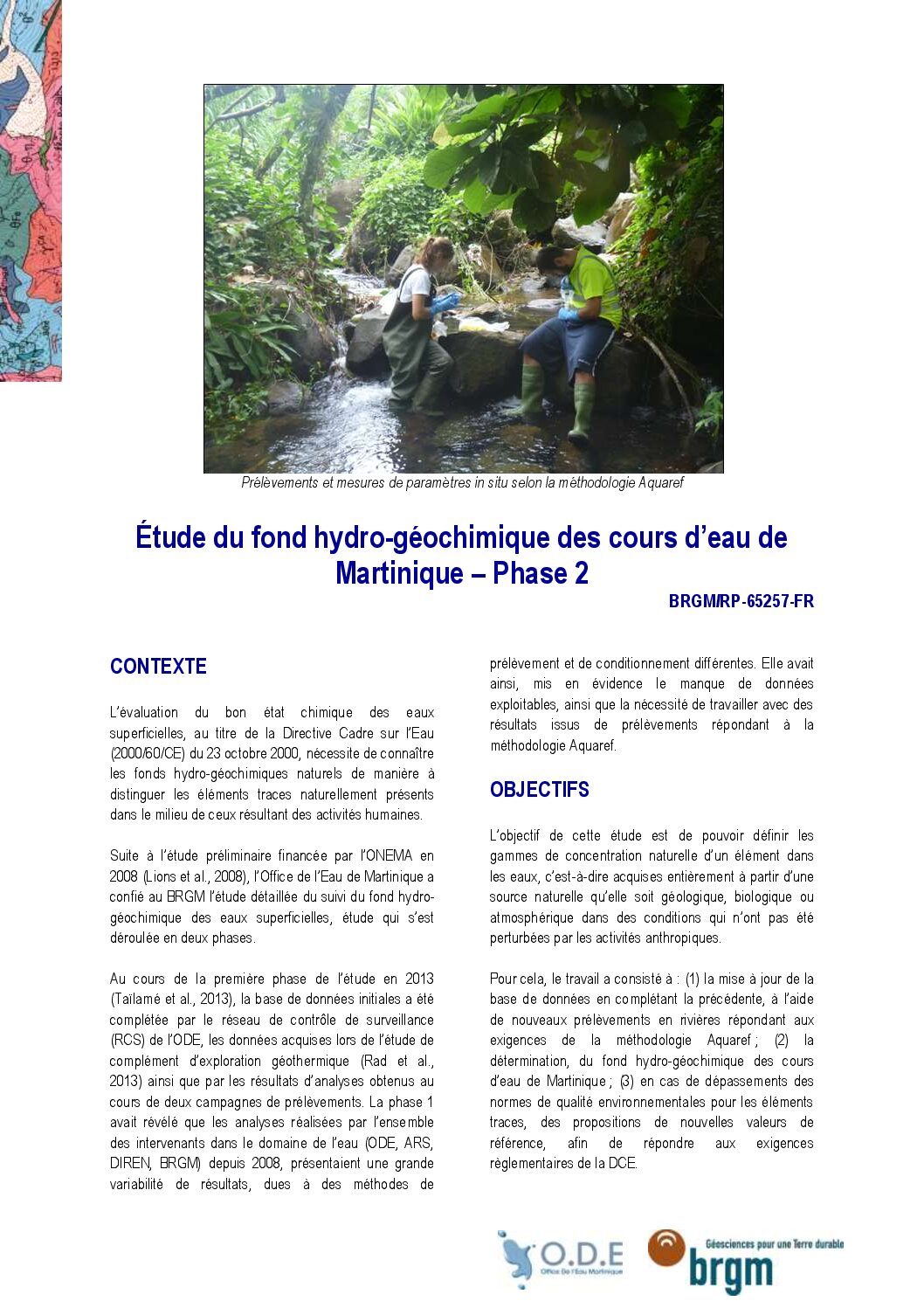 Pour cela, le travail a consisté à : (1) la mise à jour de la base de données en complétant la précédente, à l’aide de nouveaux prélèvements en rivières répondant aux exigences de la méthodologie Aquaref ; (2) la détermination, du fond hydro-géochimique des cours d’eau de Martinique ; (3) en cas de dépassements des normes de qualité environnementales pour les éléments traces, des propositions de nouvelles valeurs de référence, afin de répondre aux exigences règlementaires de la DCE.
