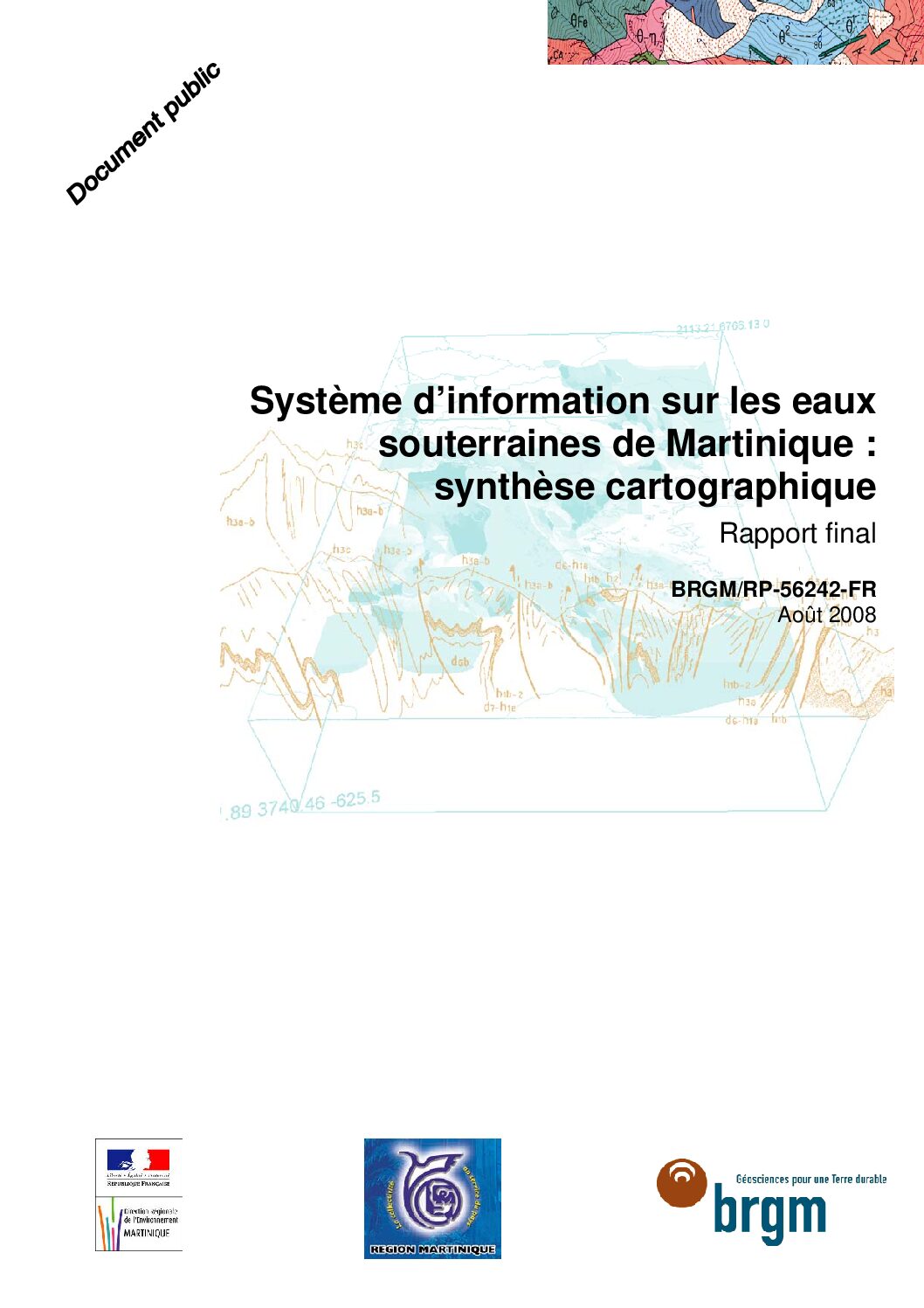 Le présent rapport correspond à la synthèse cartographique des données acquises dans les précédents volets d’élaboration du Système d’Information Régional : identification, caractérisations quantitatives, qualitatives et évaluation de la vulnérabilité intrinsèque des eaux souterraines de Martinique.