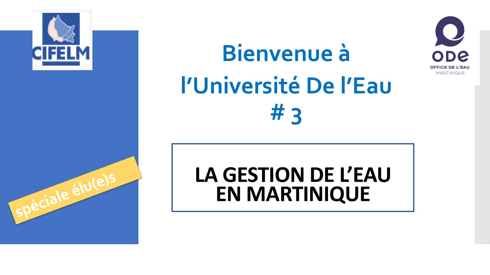Support de présentation des 3èmes Universités de l’Eau de la Martinique organisées par l’ODE (Office de l’Eau) Martinique et le CIFELM (Centre d’Information et de Formation des Elus Locaux de la Martinique) en février 2022.