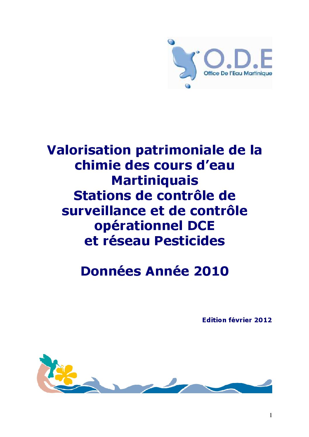 Ce rapport a pour but de présenter la qualité des cours d’eau étudiés en 2010 sur les réseaux gérés par l’ODE. Il s’agit des réseaux DCE cours d’eau pour la chimie et la physicochimie, ainsi que du réseau « pesticides ».L’ensemble des composantes biologiques sur les cours d’eau est étudié par la DEAL (Ex-DIREN).