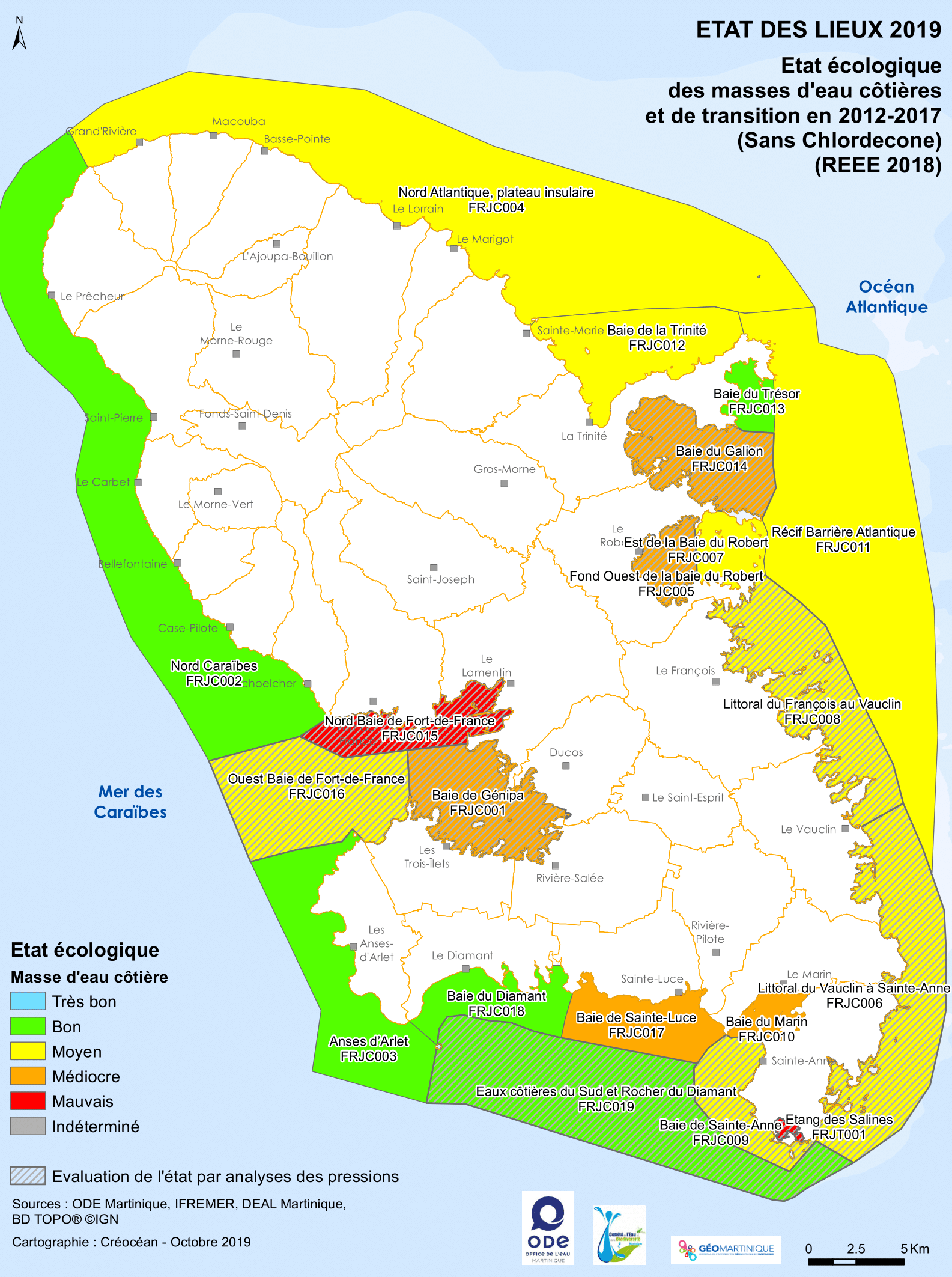 État des lieux 2019 – État écologique sans prise en compte de la chlordécone des masses d'eau côtières et de transition en 2012-2017 (REEE 2018)