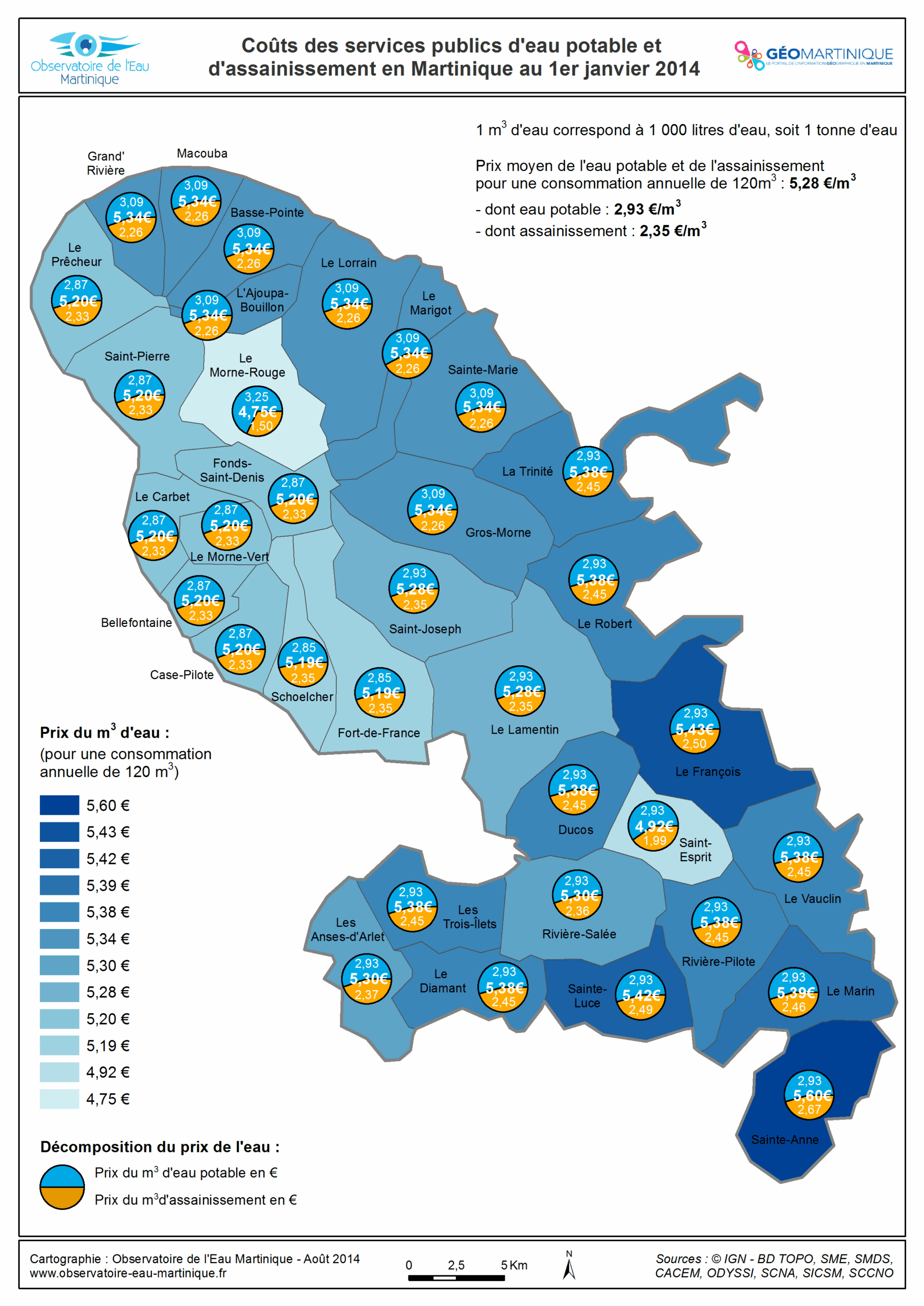 Coût des services publics d'eau et d'assainissement en Martinique au 1er janvier 2014